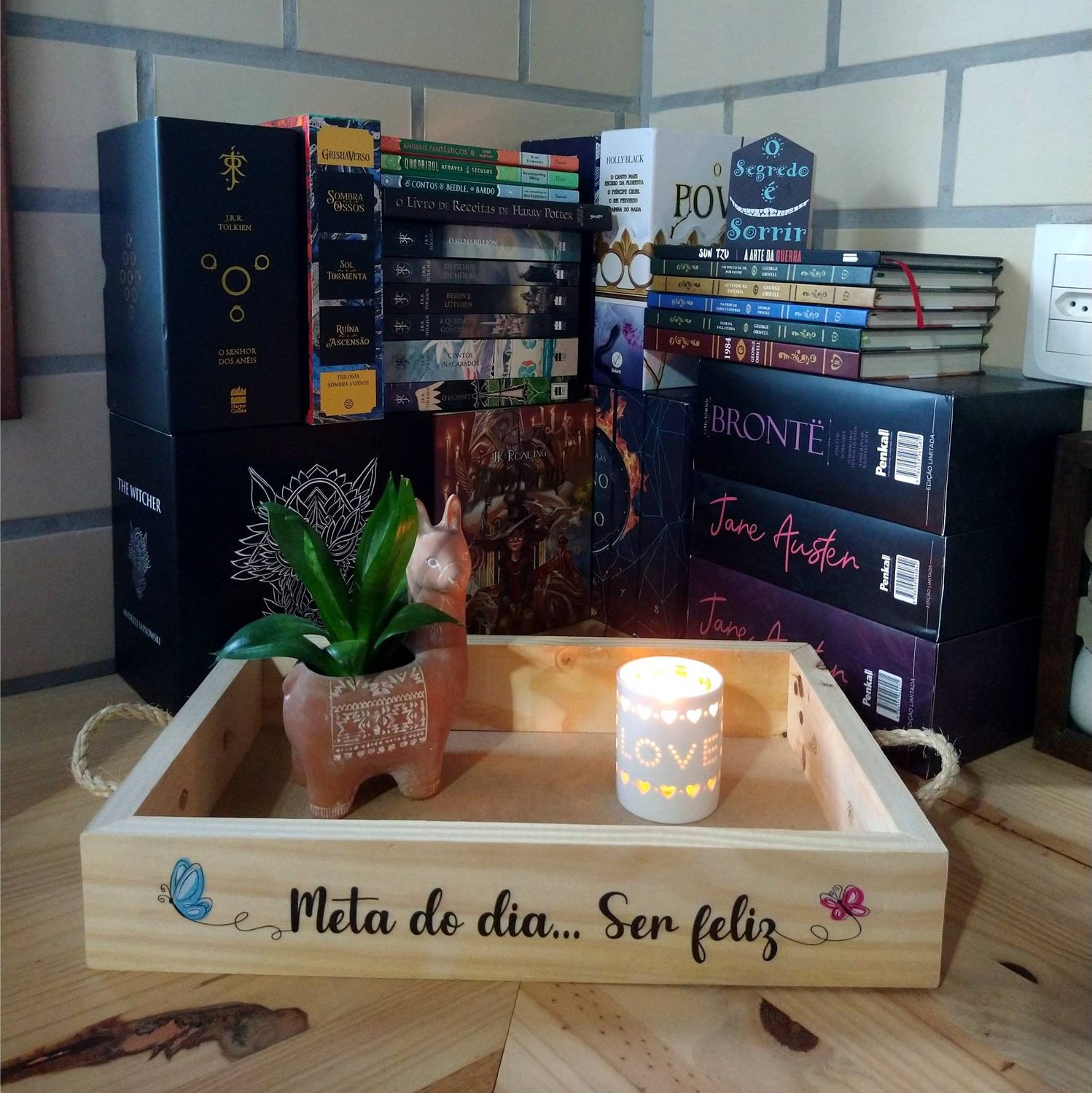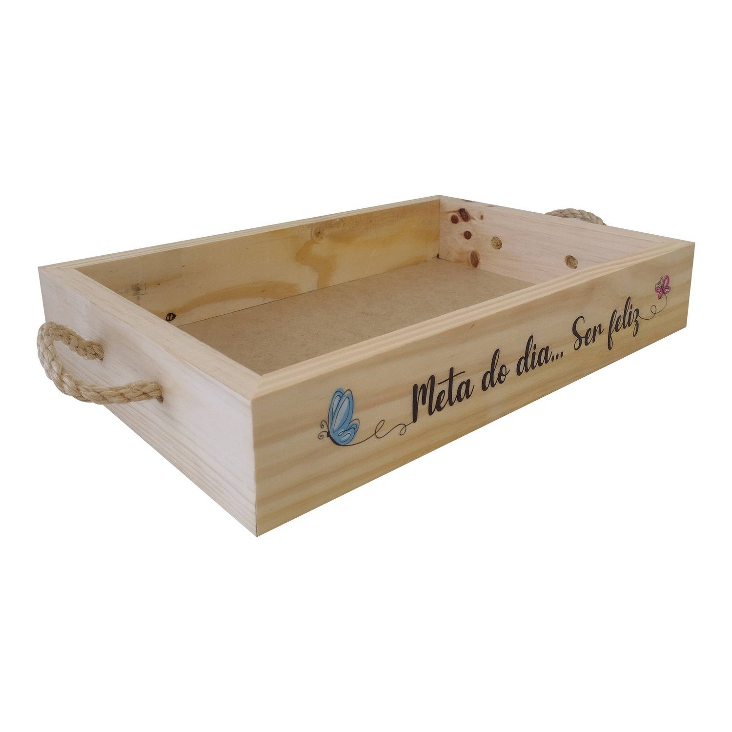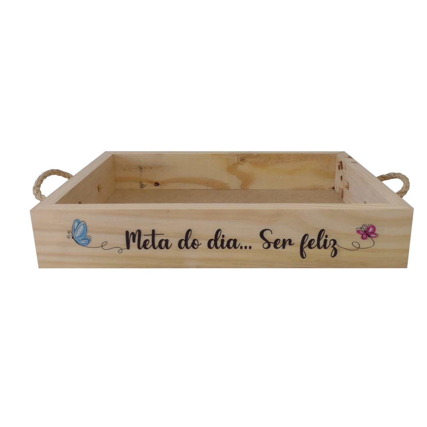 Bandeja Decorativa em madeira de pinus, fundo em mdf 3mm, alça em sisal e frase na lateral – Meta do Dia... Ser Feliz! Essa bandeja possui a lateral com impressão diretamente sobre a madeira, deixando sua bandeja ainda mais linda.