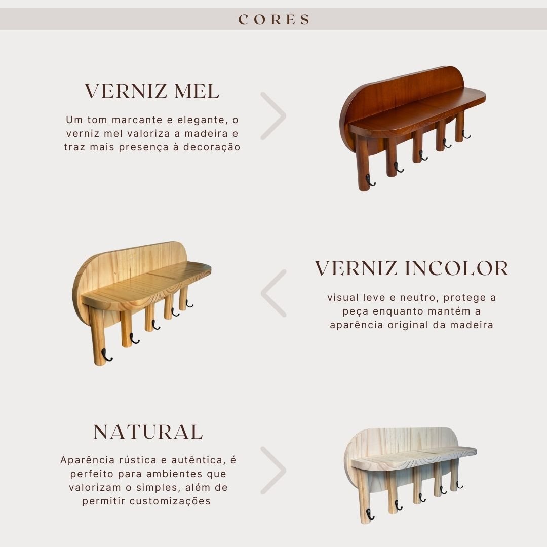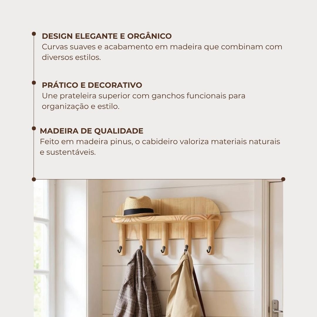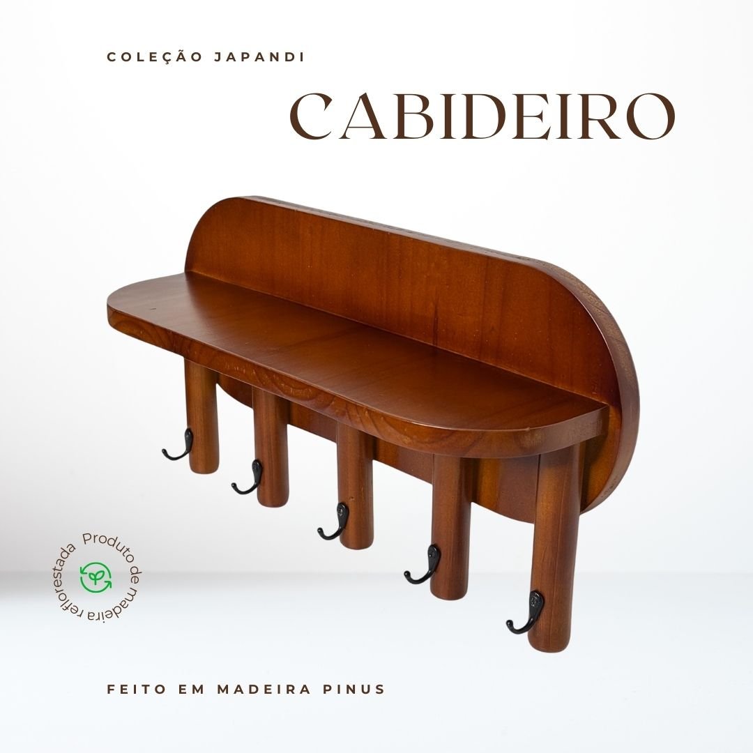 Fabricado em madeira pinus de origem sustentável, o cabideiro garante durabilidade e resistência.. A instalação é simples e segura, com suportes robustos que fixam a peça firmemente na parede, trazendo tranquilidade e praticidade para seu uso diário.