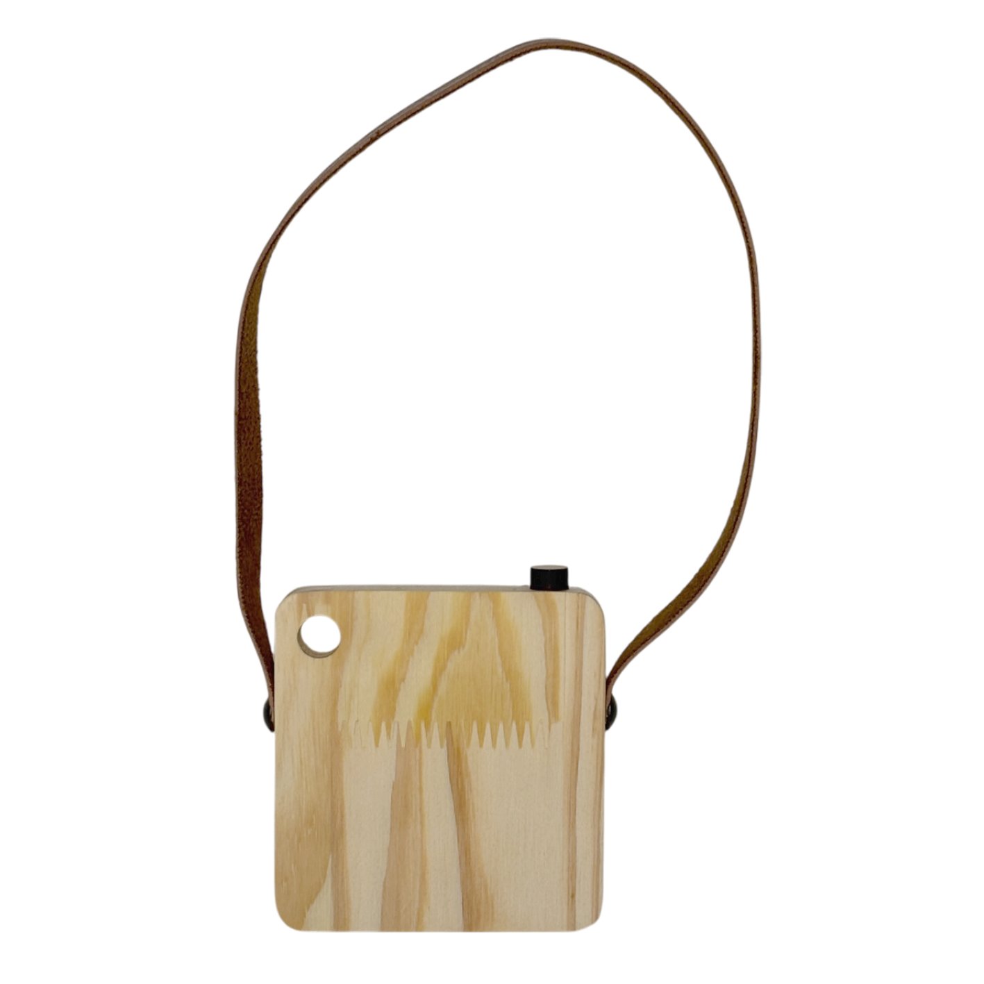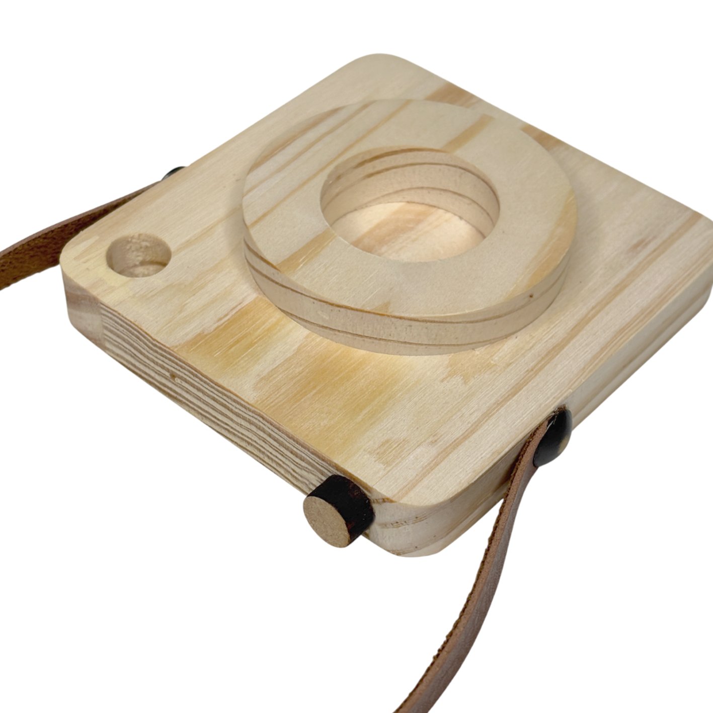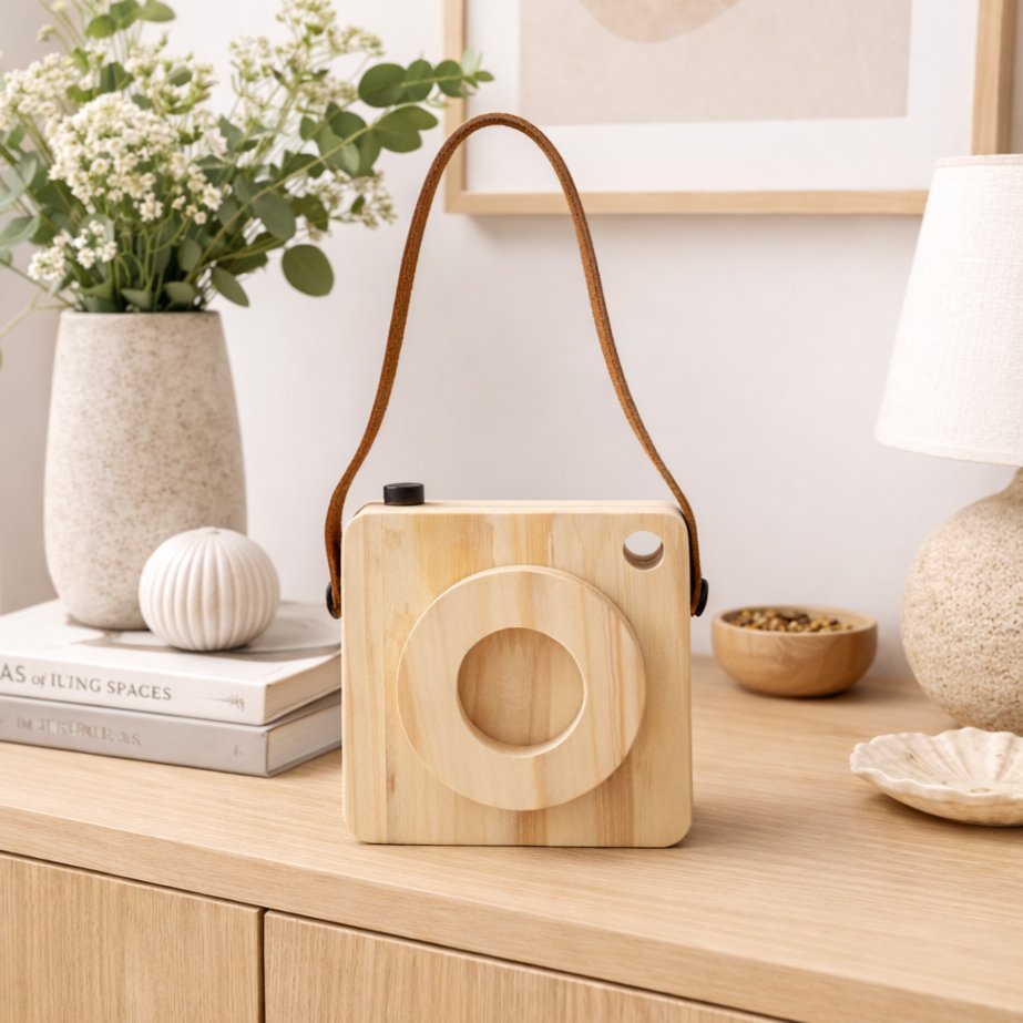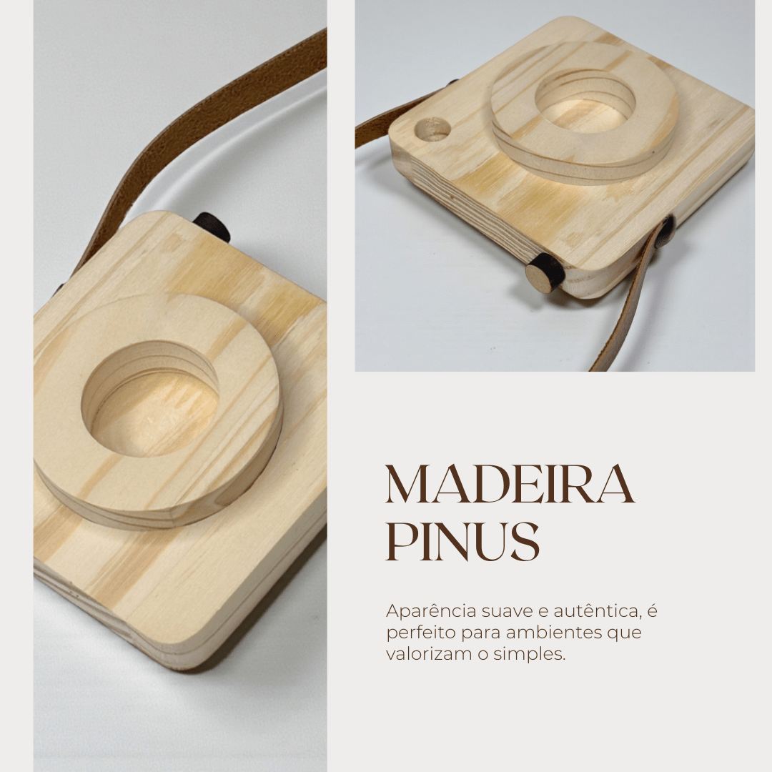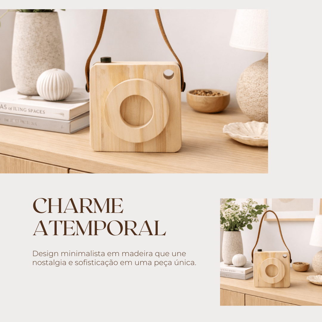 A textura dos veios da madeira se destaca de maneira elegante, trazendo um aspecto orgânico, quente e aconchegante, enquanto a faixa de couro adiciona contraste e sofisticação. O couro envolve parte da peça com precisão e cria uma composição visual que lembra câmeras antigas, evocando nostalgia, delicadeza e criatividade.