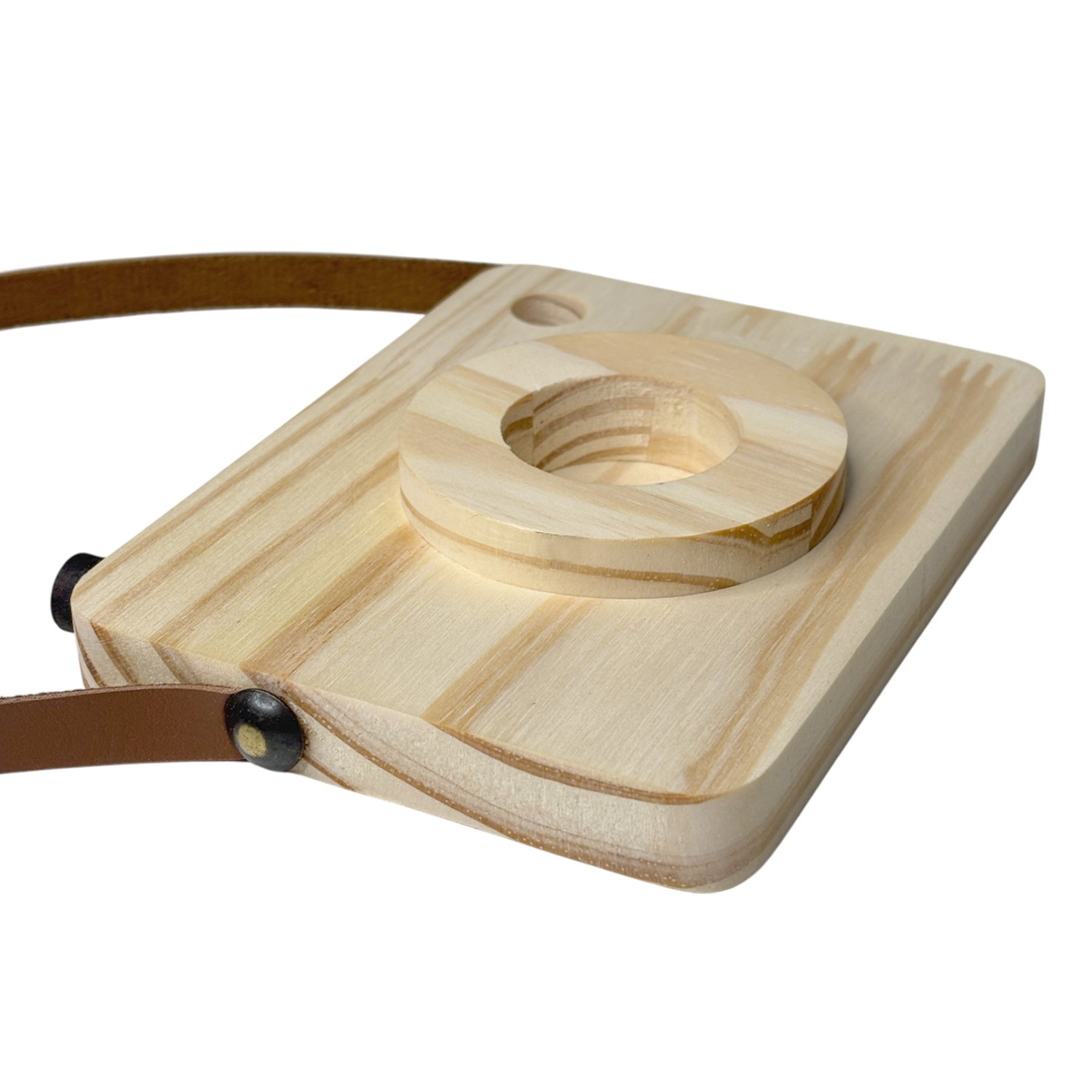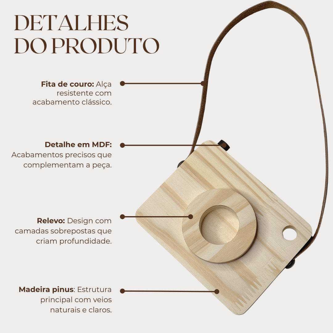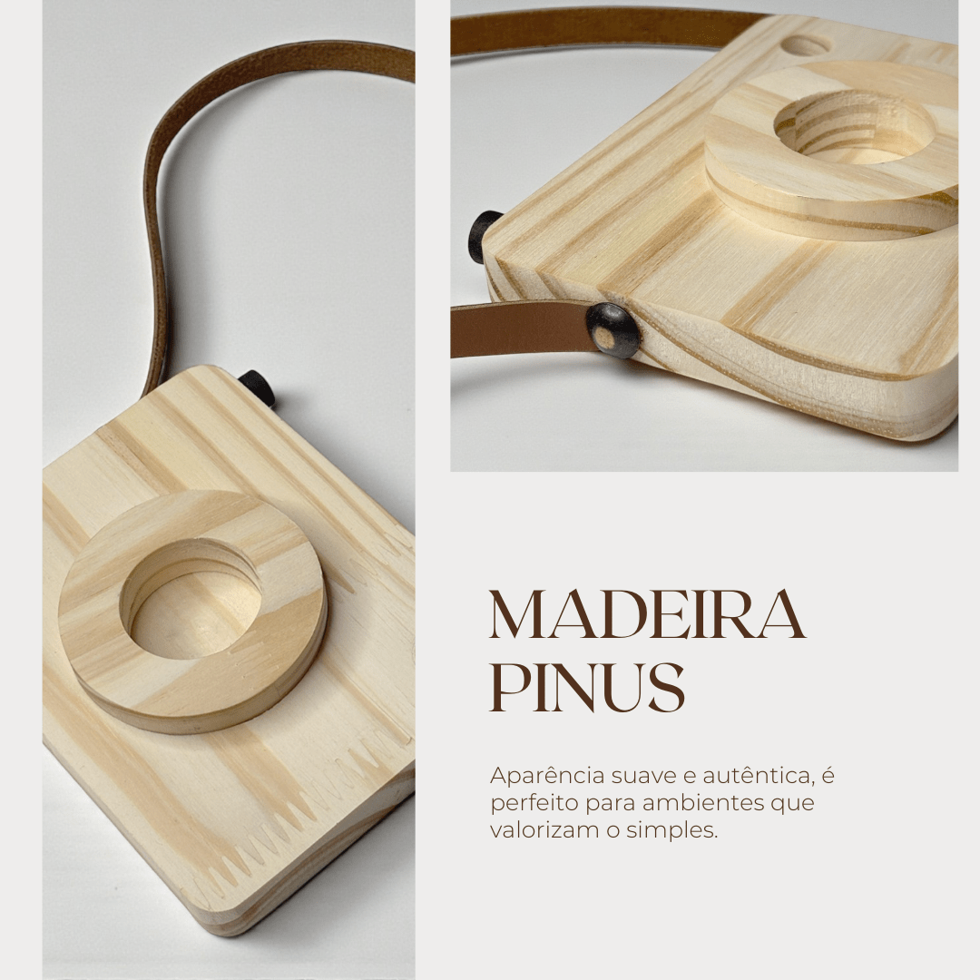 A textura dos veios da madeira se destaca de maneira elegante, trazendo um aspecto orgânico, quente e aconchegante, enquanto a faixa de couro adiciona contraste e sofisticação. O couro envolve parte da peça com precisão e cria uma composição visual que lembra câmeras antigas, evocando nostalgia, delicadeza e criatividade.