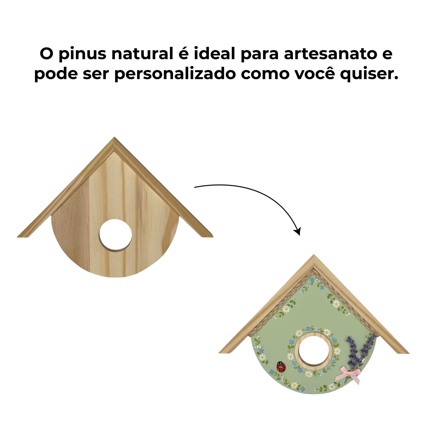 O pinus é uma madeira nobre, sustentável e charmosa, com coloração clara e textura suave que valoriza qualquer ambiente. Você pode deixá-la no tom natural para um visual mais orgânico, ou aplicar verniz, tinta ou decoupage para personalizar conforme o seu gosto. Essa liberdade criativa permite transformar a casinha em uma peça de decoração artesanal única.