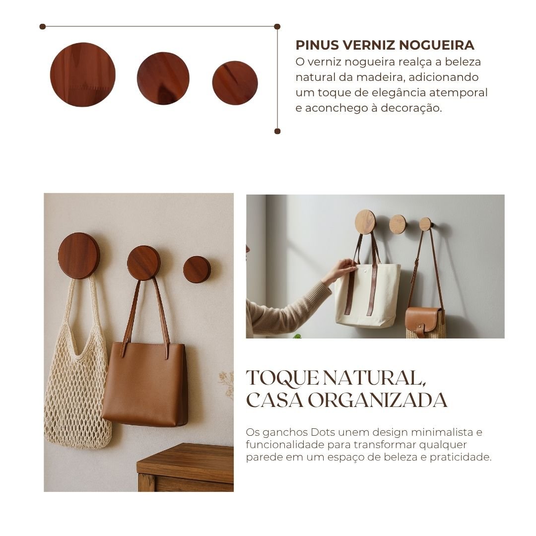 O Conjunto de 3 Ganchos Dots em Pinus é a escolha perfeita para quem valoriza materiais naturais, durabilidade e design atemporal. Além de organizar, ele transforma o ambiente com leveza e sofisticação. Fácil de instalar, resistente e sustentável, é a união ideal entre funcionalidade e estética.