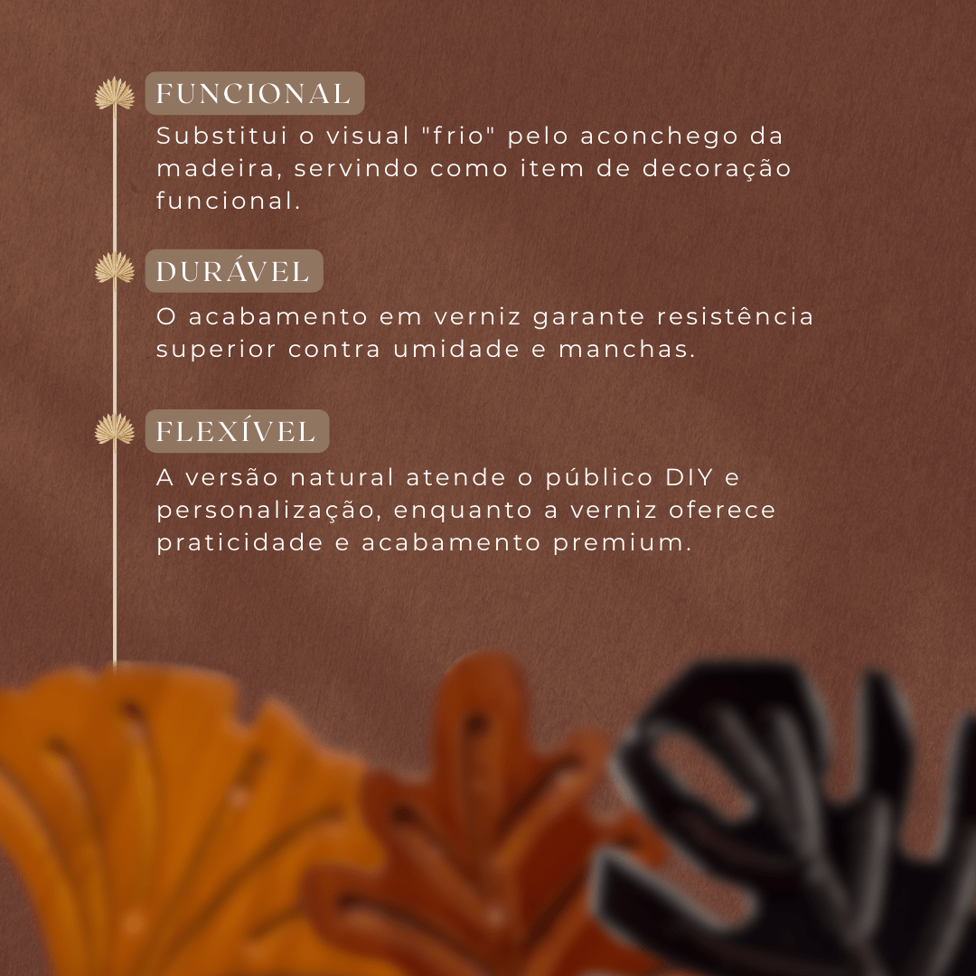 Imagine chegar em casa e se deparar com um detalhe que une natureza, sofisticação e funcionalidade em perfeita harmonia. Cada peça é cuidadosamente trabalhada em madeira pinus de alta qualidade, e ganha vida através de frisos delicados que destacam o desenho das folhas, transformando cada cabideiro em uma obra única de arte natural.