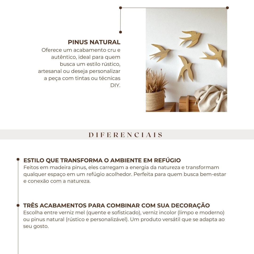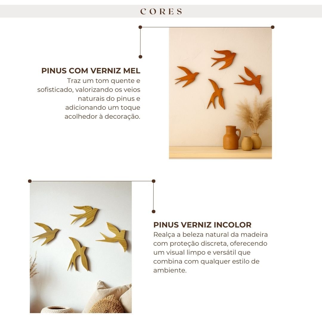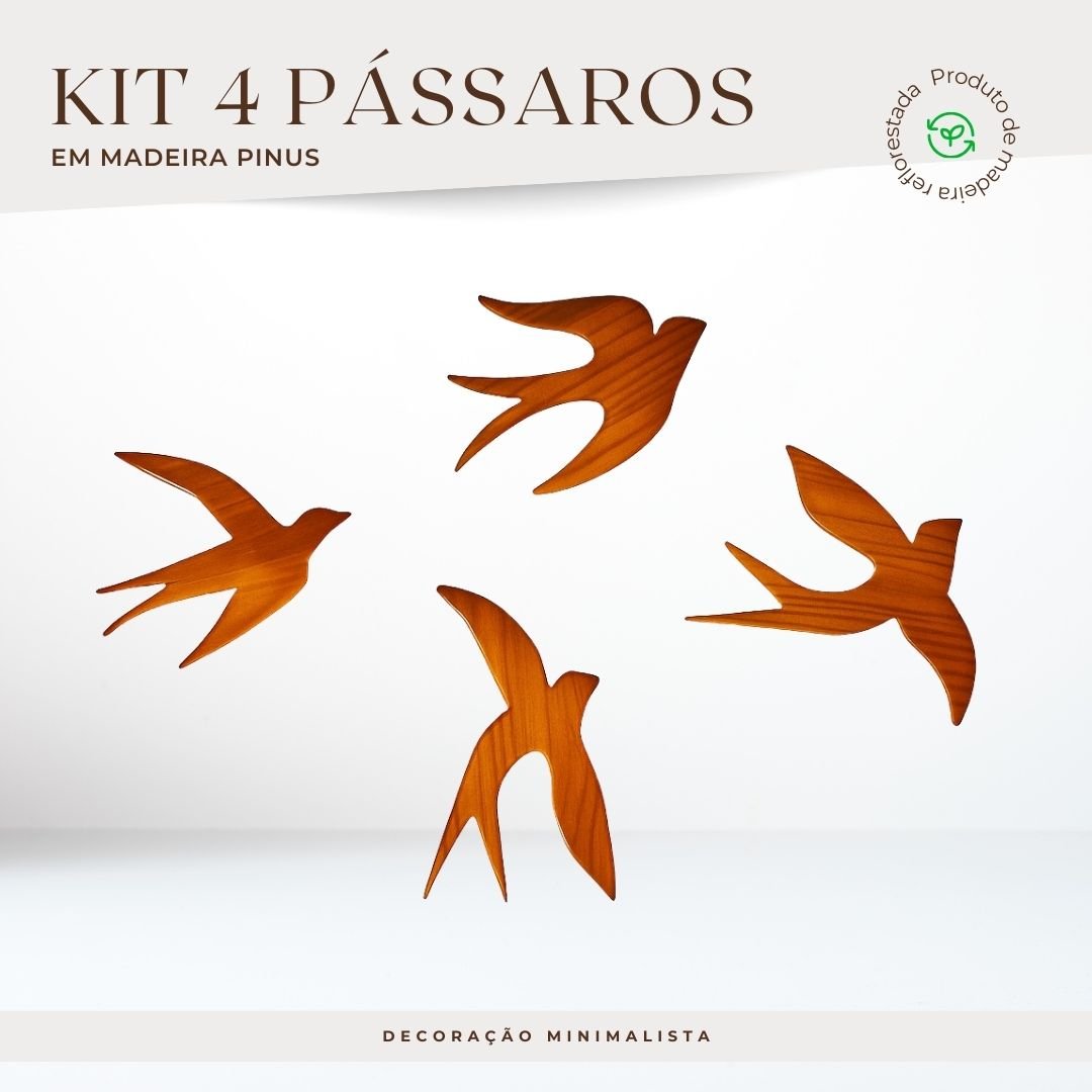 Conjunto 4 Pássaros Decorativos Escultura de Parede Estilo Minimalista em Madeira Pinus