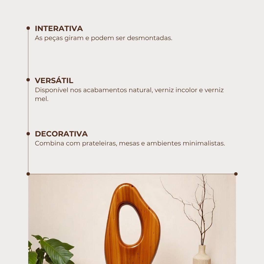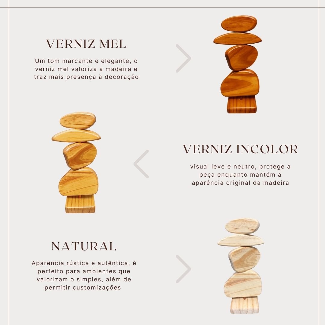Disponível em três acabamentos, o pinus natural destaca a beleza crua da madeira, o verniz incolor adiciona um brilho suave e o verniz mel oferece um toque acolhedor. Esta escultura contribui para um ambiente mais sereno, ideal para momentos de descanso e reflexão.