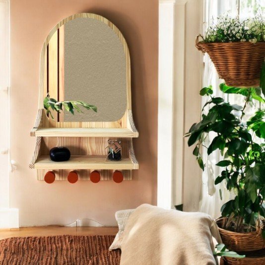 Mais do que um espelho, esta peça multifuncional combina estética e praticidade em uma solução completa. Ideal para halls, entradas ou quartos, une o design orgânico do espelho com prateleiras e cabideiros em madeira pinus com acabamento natural, criando uma estação de apoio ideal para o dia a dia. Pendure chaves, bolsas, cachecóis e organize objetos de forma prática e charmosa.