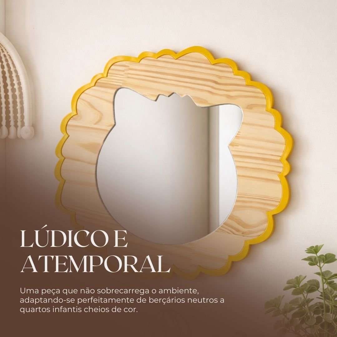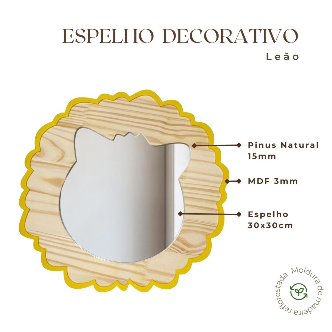 Com um acabamento impecável, este item se adapta com facilidade a decorações nos estilos Boho, Escandinavo ou Minimalista, garantindo aquele visual cheio de personalidade que toda família deseja. Ao escolher o nosso Espelho Leão, você investe em um produto sustentável que une a nobreza da madeira natural a um design apaixonante, capaz de acompanhar o crescimento do seu filho e criar memórias inesquecíveis em um espaço decorado com amor.