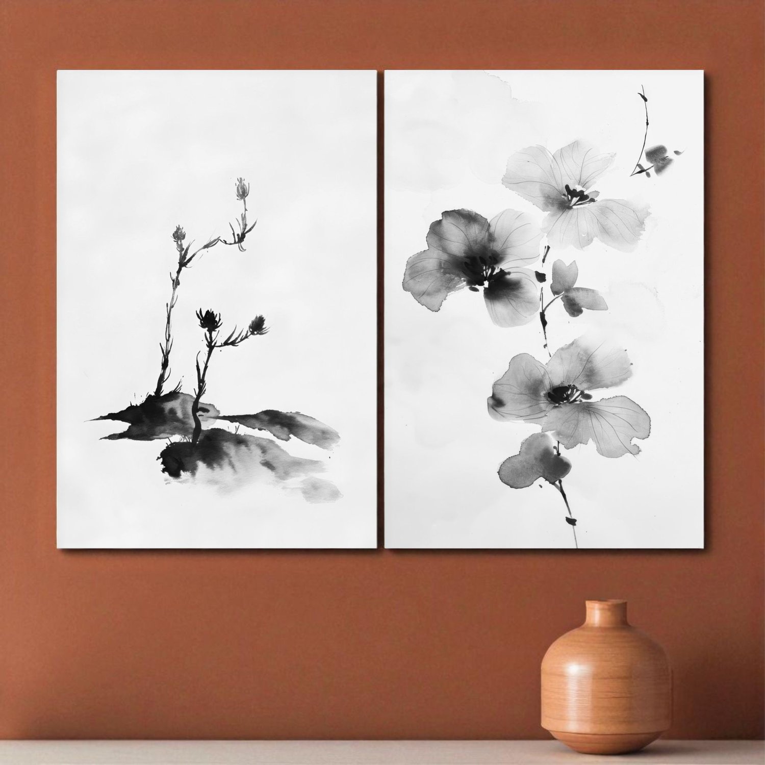 Kit 2 Placas Decorativas Meiso Orquídea Florescendo no Estilo Sumie