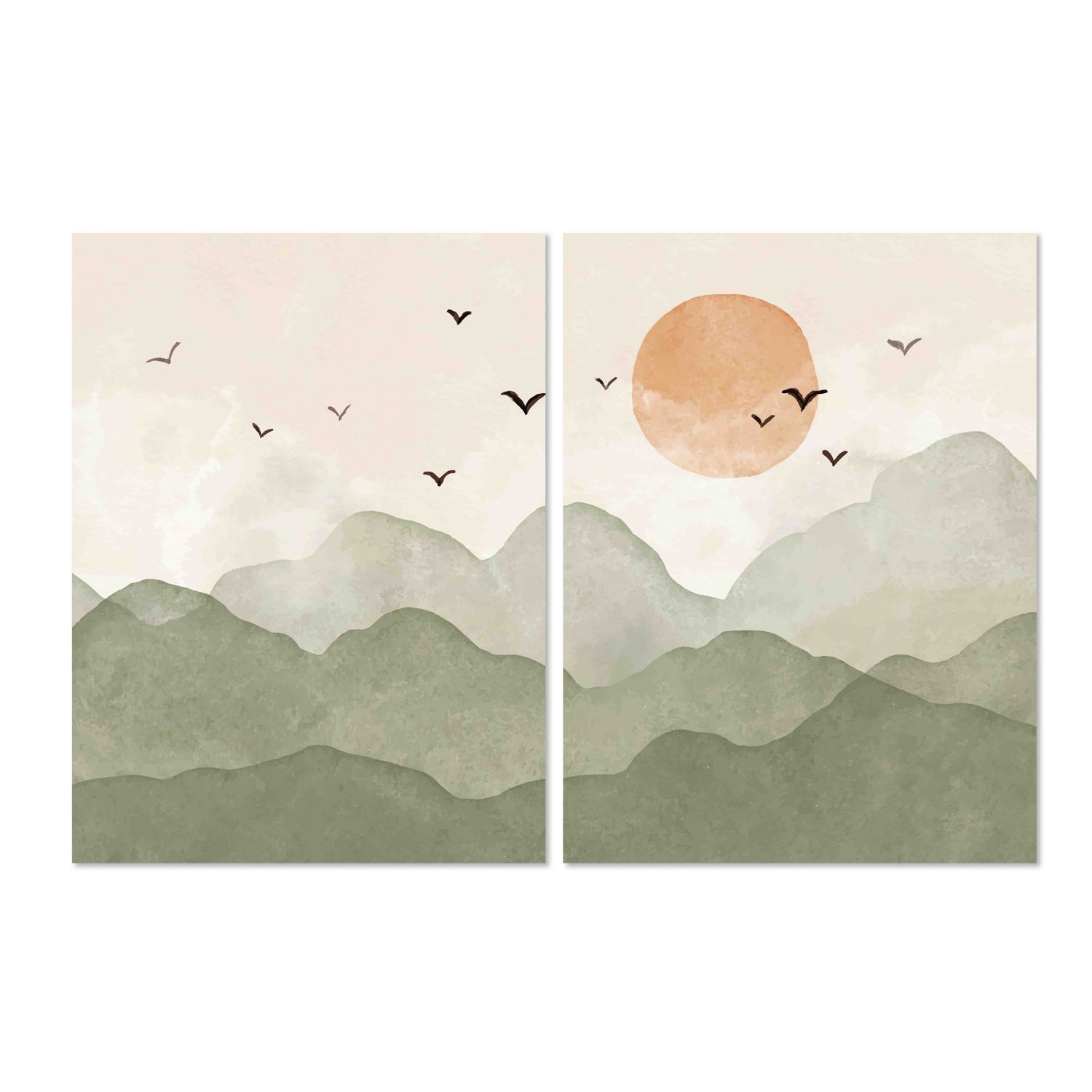 Kit 2 Placas Decorativas Pássaros nas Montanhas E Sol Aquarela Estilo Japandi