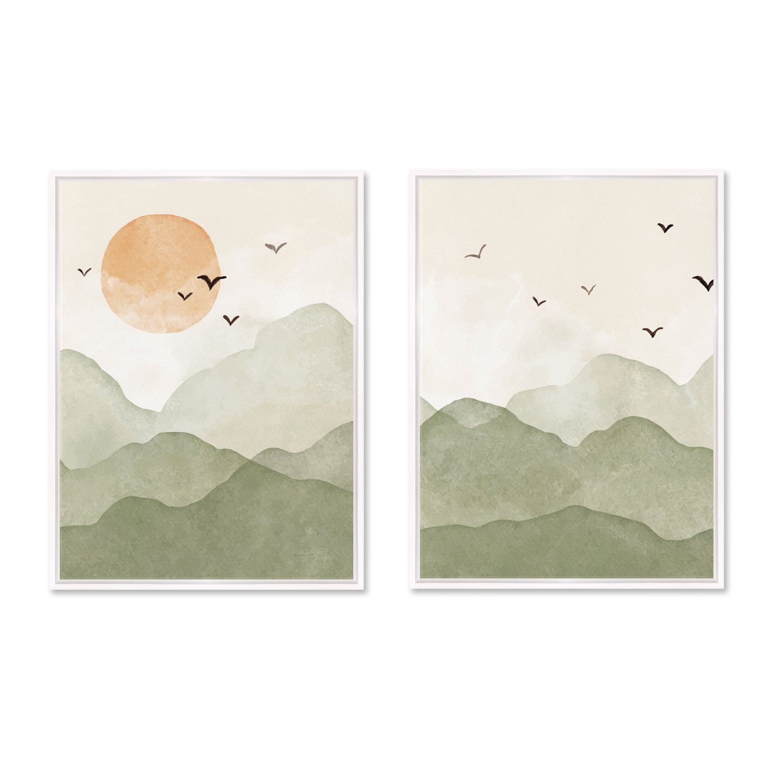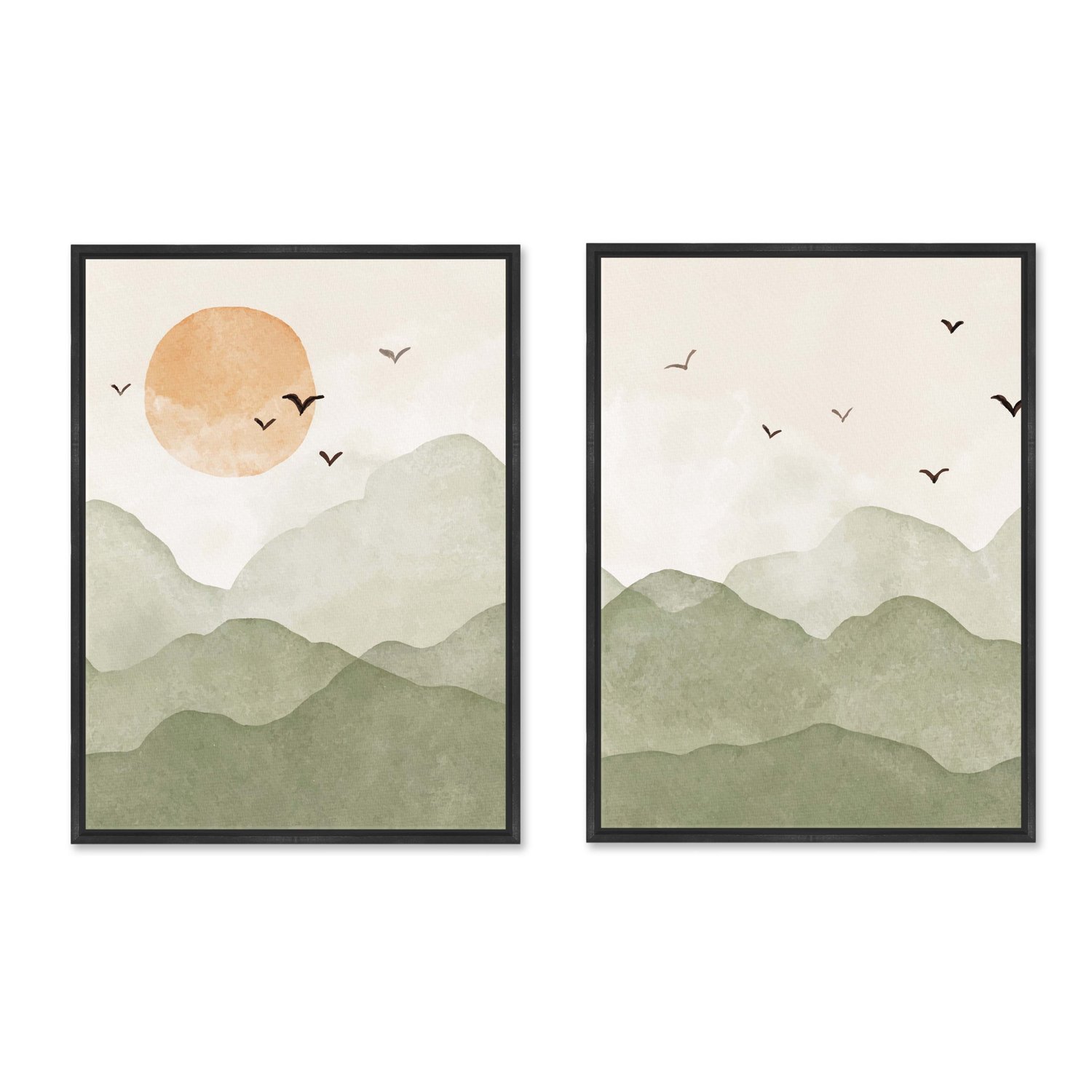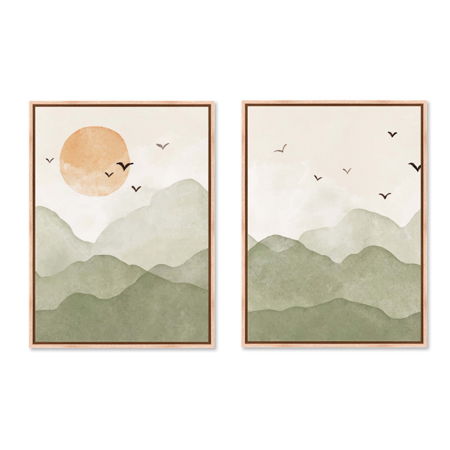 Kit 2 Quadros Em Tela Canvas Montanhas Com Sol E Pássaros Aquarela Estilo Japandi