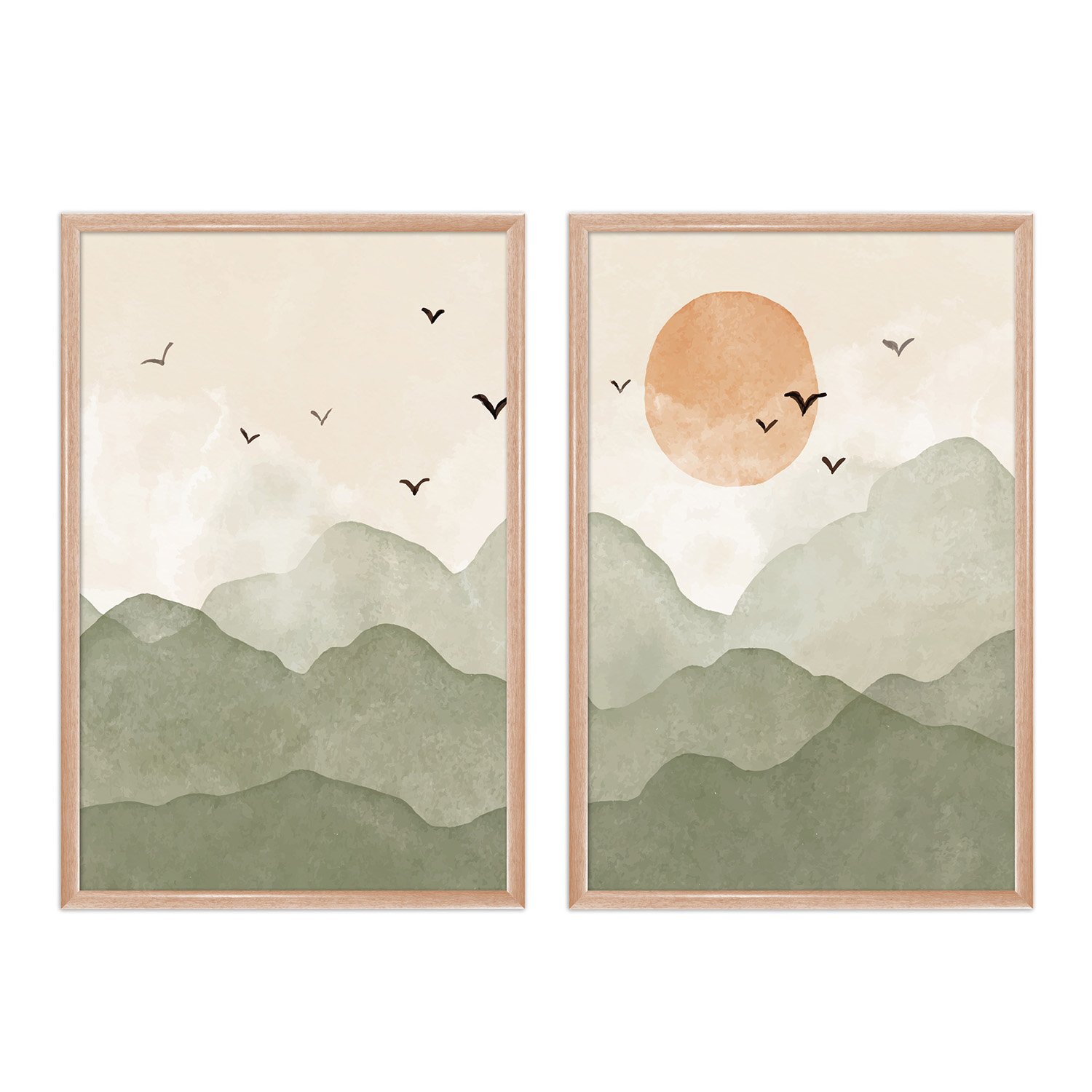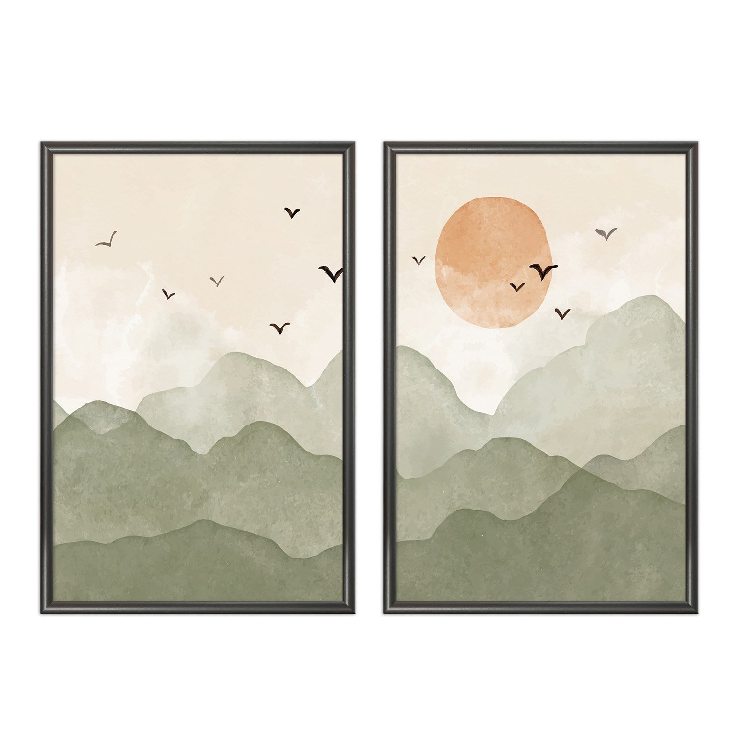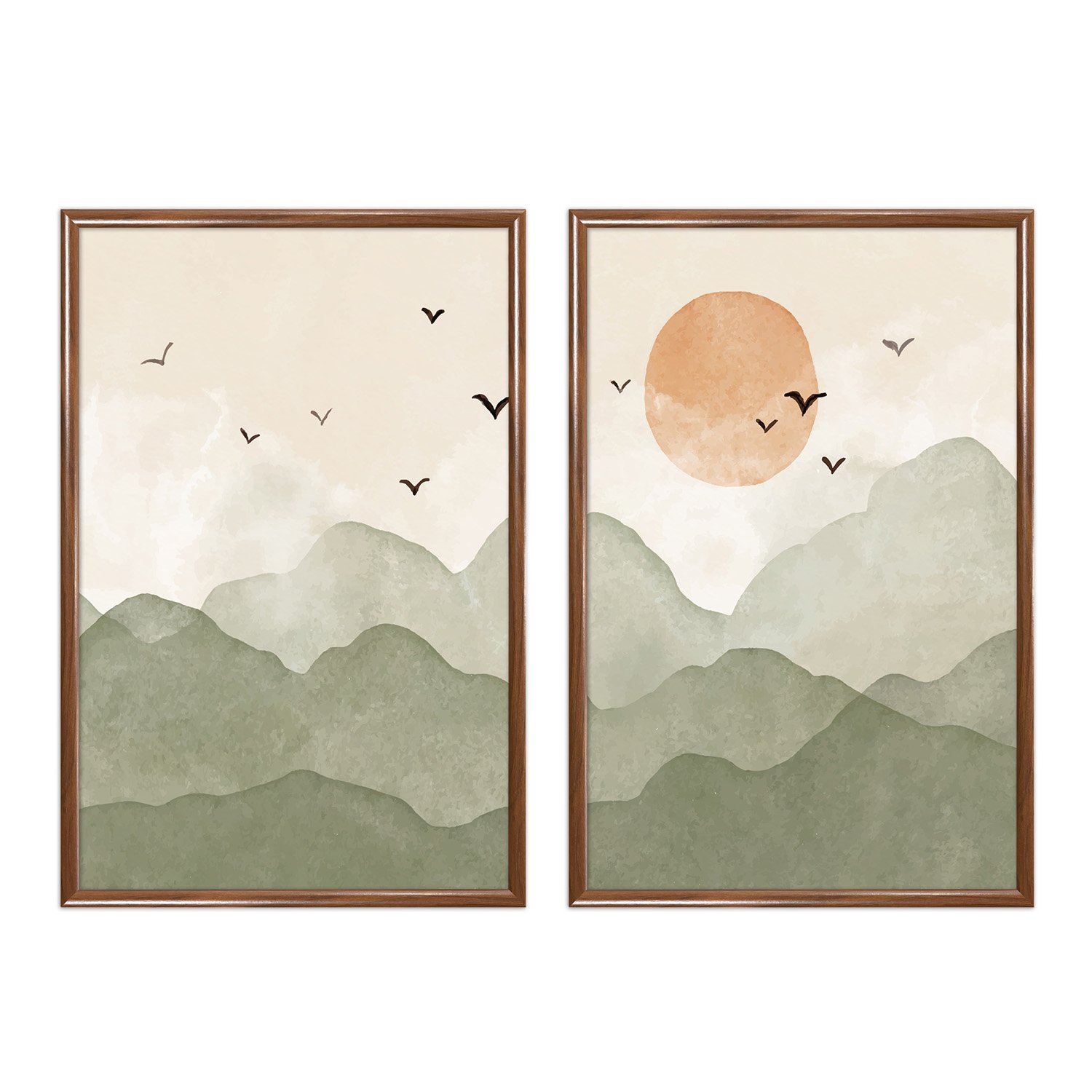 Kit Quadros Decorativos Pássaros nas Montanhas E Sol Aquarela
