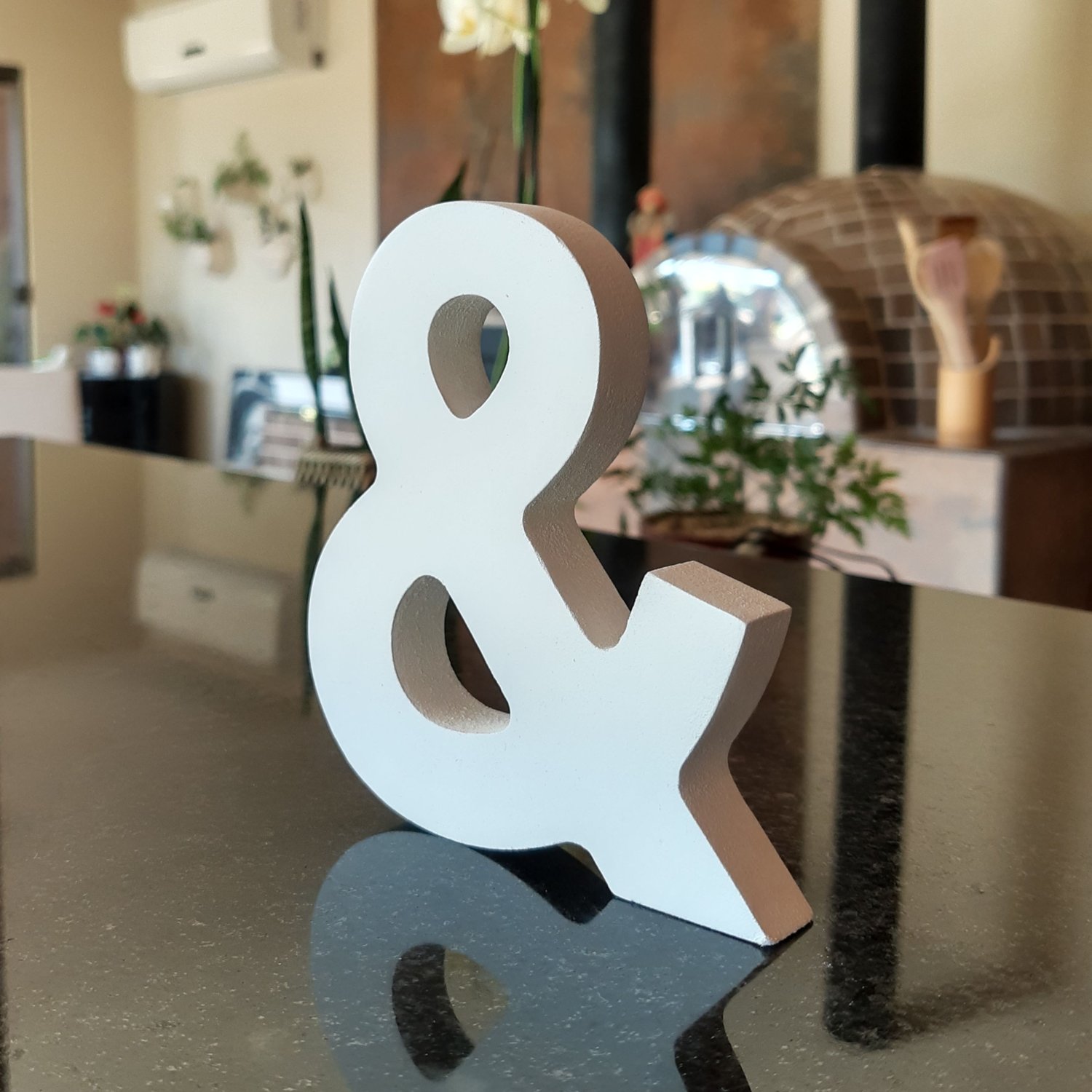 Letra & - (e comercial) em mdf Laqueado Branco de 15mm, pode ser usado em pé sobre móveis e estantes. Letra fabricada sem emendas em equipamento de alta precisão ideal para cortes em madeira e mdf. Pintura laqueada com tinta PU, a melhor do mercado