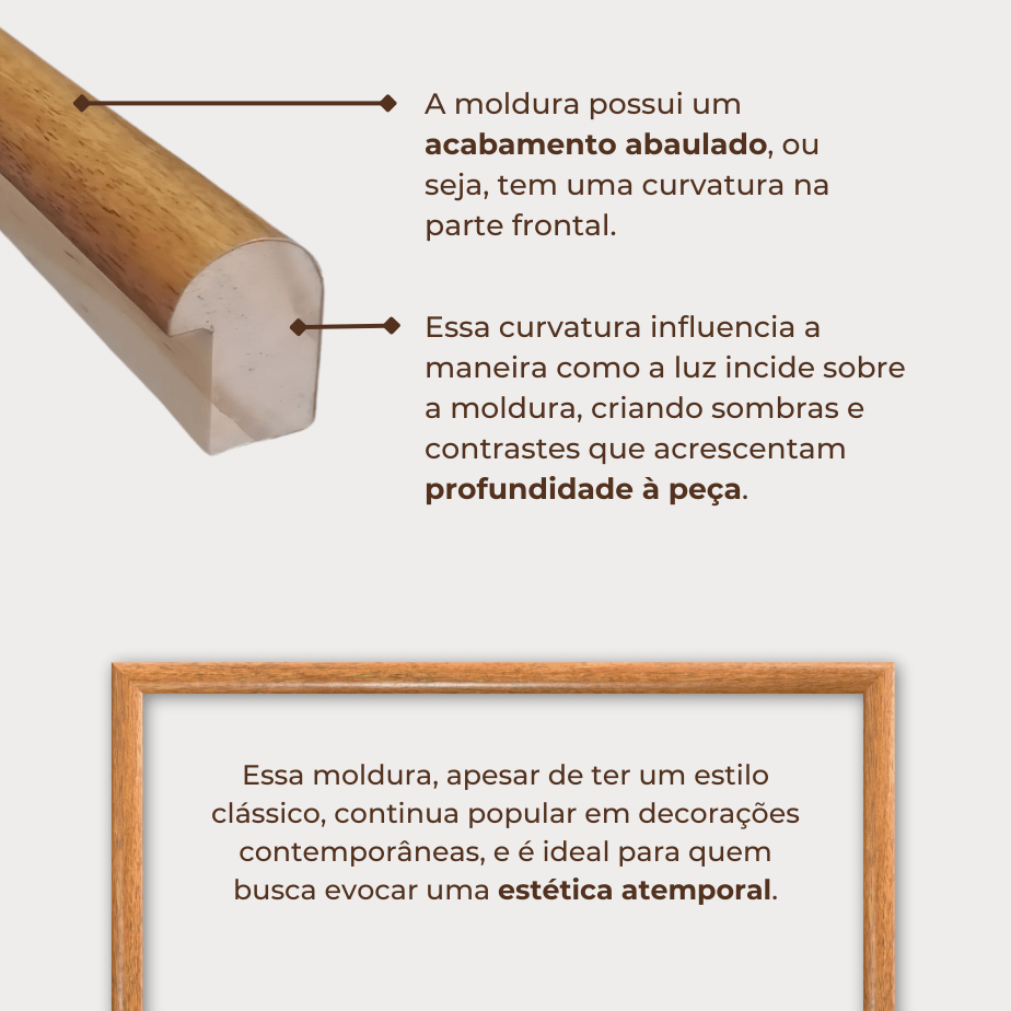 Imagine transformar seu espaço com uma moldura que não só emoldura, mas também valoriza sua obra de arte ou fotografia! A moldura abaulada possui um estilo clássico, e é perfeita para adicionar uma sensação de movimento e profundidade, pois tem um design arredondado que cria um efeito tridimensional. Feita com materiais de alta qualidade, ela traz durabilidade e um acabamento impecável, além de um revestimento altamente resistente, muito superior as molduras tradicionais em gesso, proporcionando assim alta durabilidade e beleza