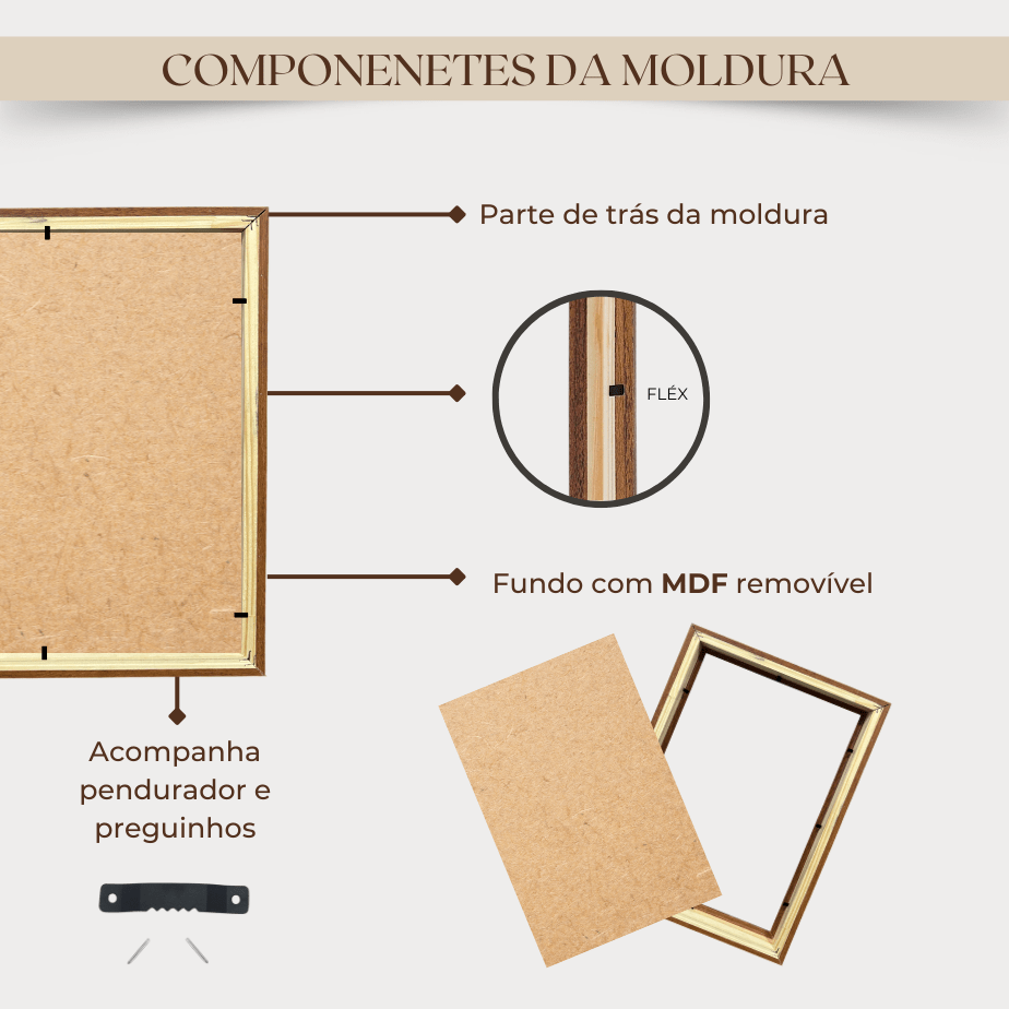Material: Moldura revestida com laminação e fundo em mdf 3mm (não acompanha proteção para a imagem)