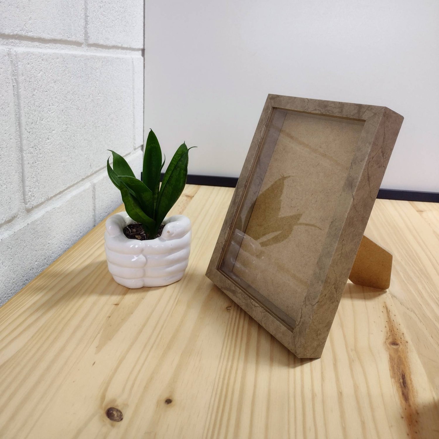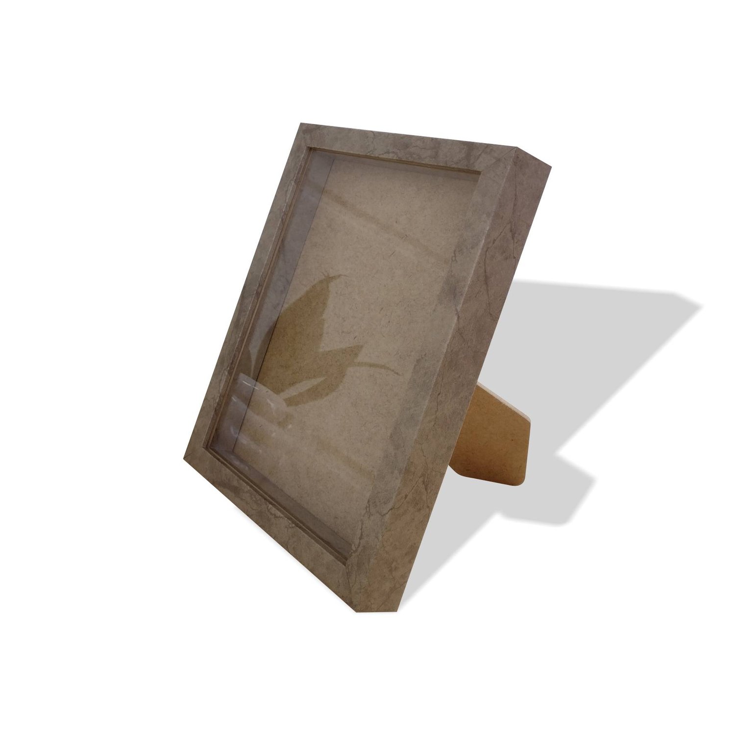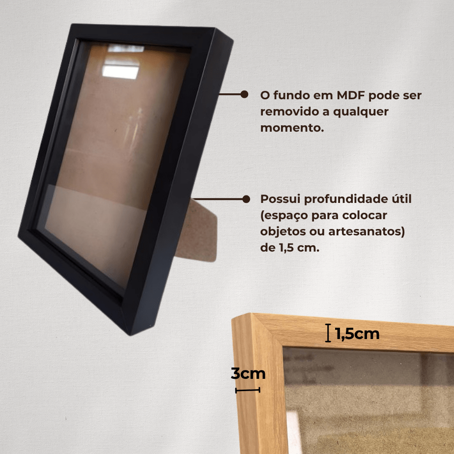 Com profundidade interna de 1,5 cm entre o vidro e o fundo, ela permite inserir peças artesanais ou afetivas sem amassar, mantendo tudo visível graças à frente de vidro já fixada (não removível). O fundo é removível, o que facilita a montagem e a troca sempre que desejar renovar seu cenário interno.