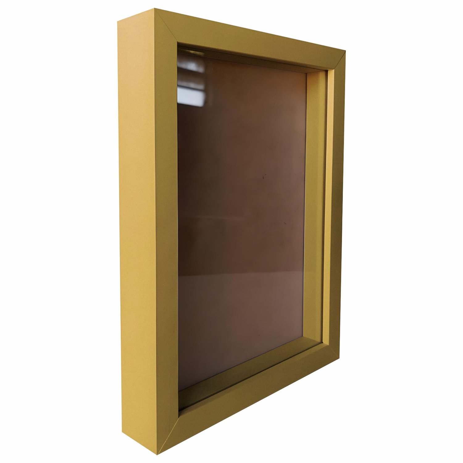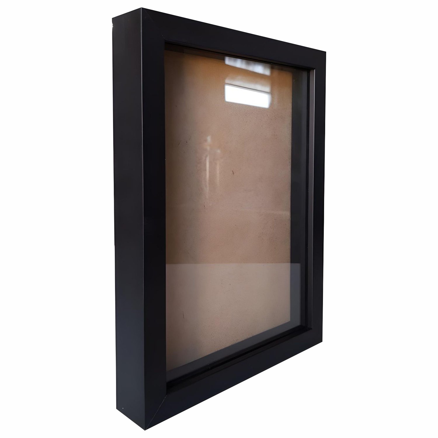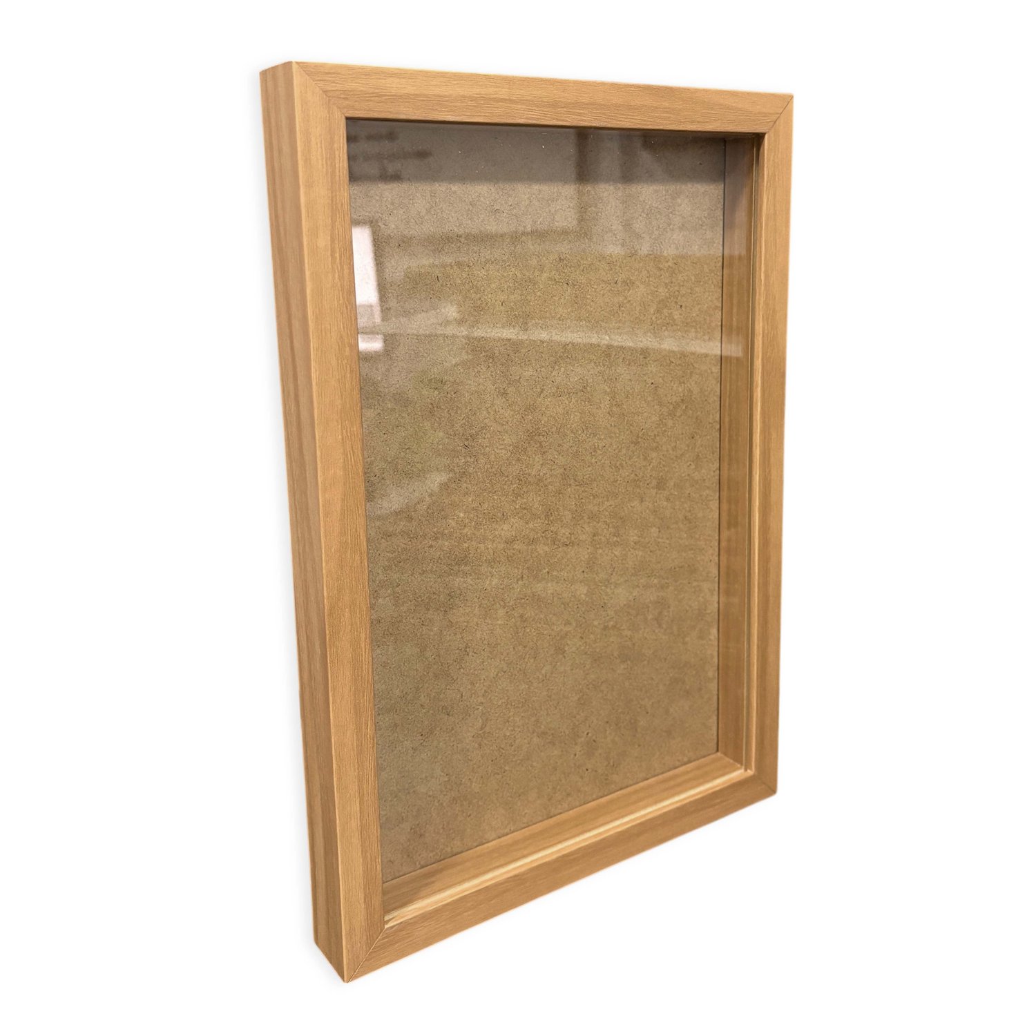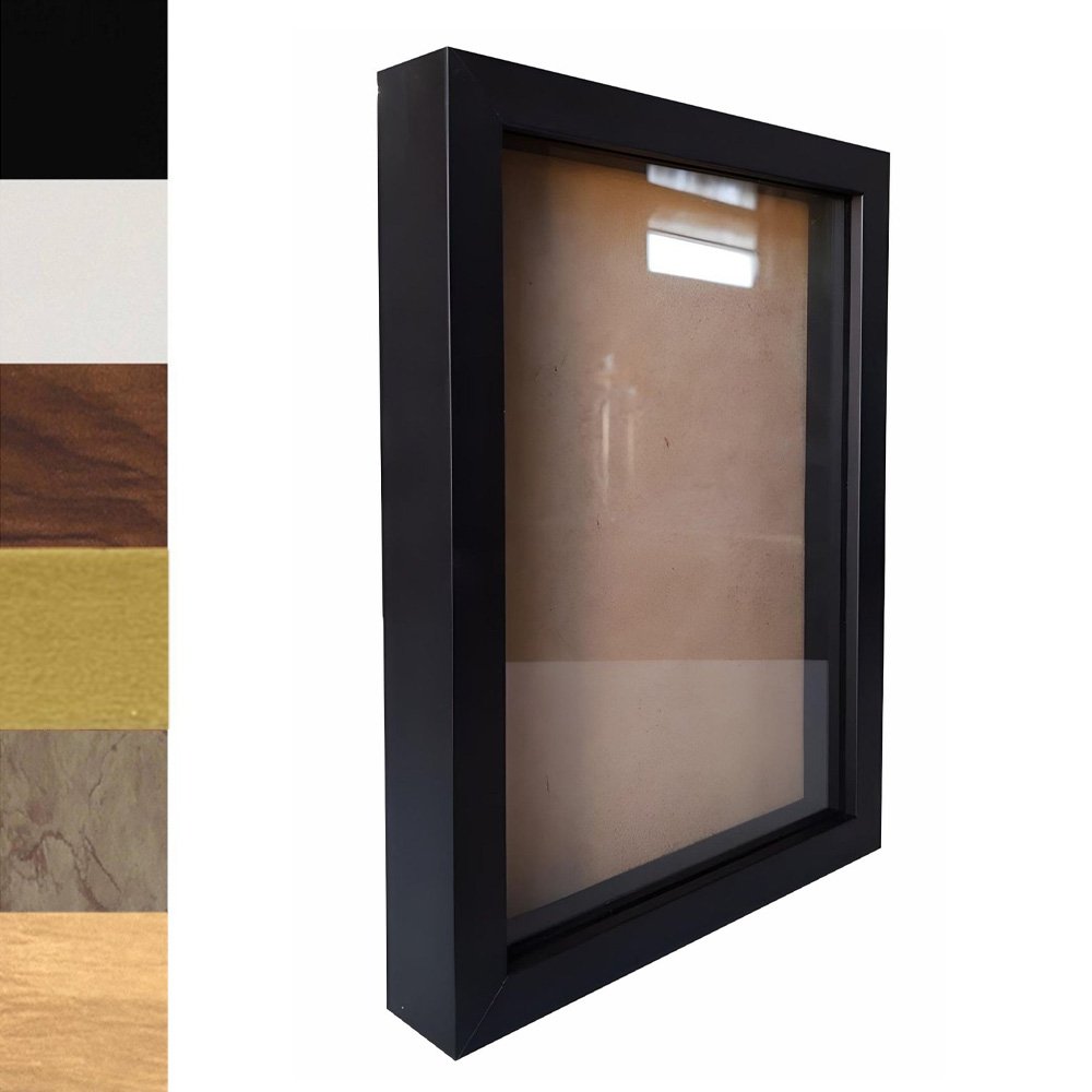 Com profundidade interna de 1,5 cm entre o vidro e o fundo, ela permite inserir peças artesanais ou afetivas sem amassar, mantendo tudo visível graças à frente de vidro já fixada (não removível). O fundo é removível, o que facilita a montagem e a troca sempre que desejar renovar seu cenário interno.