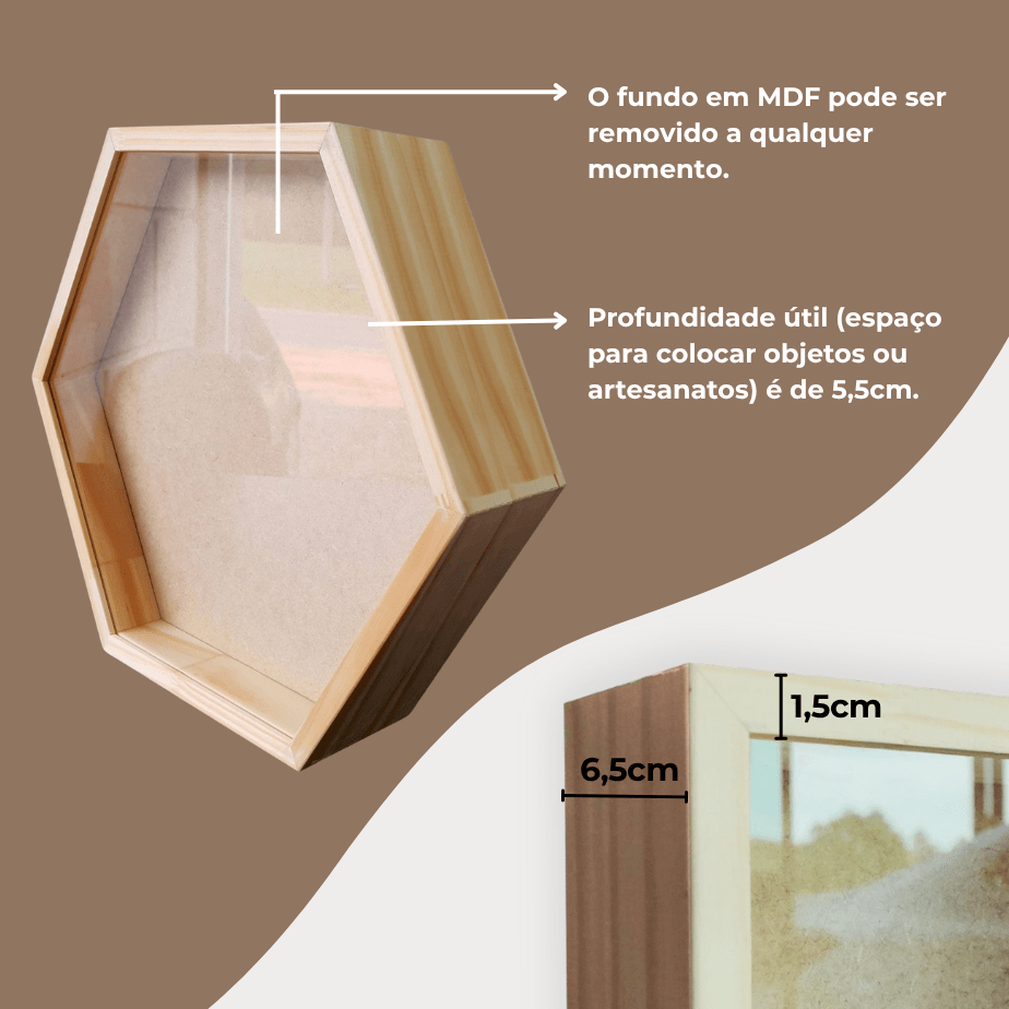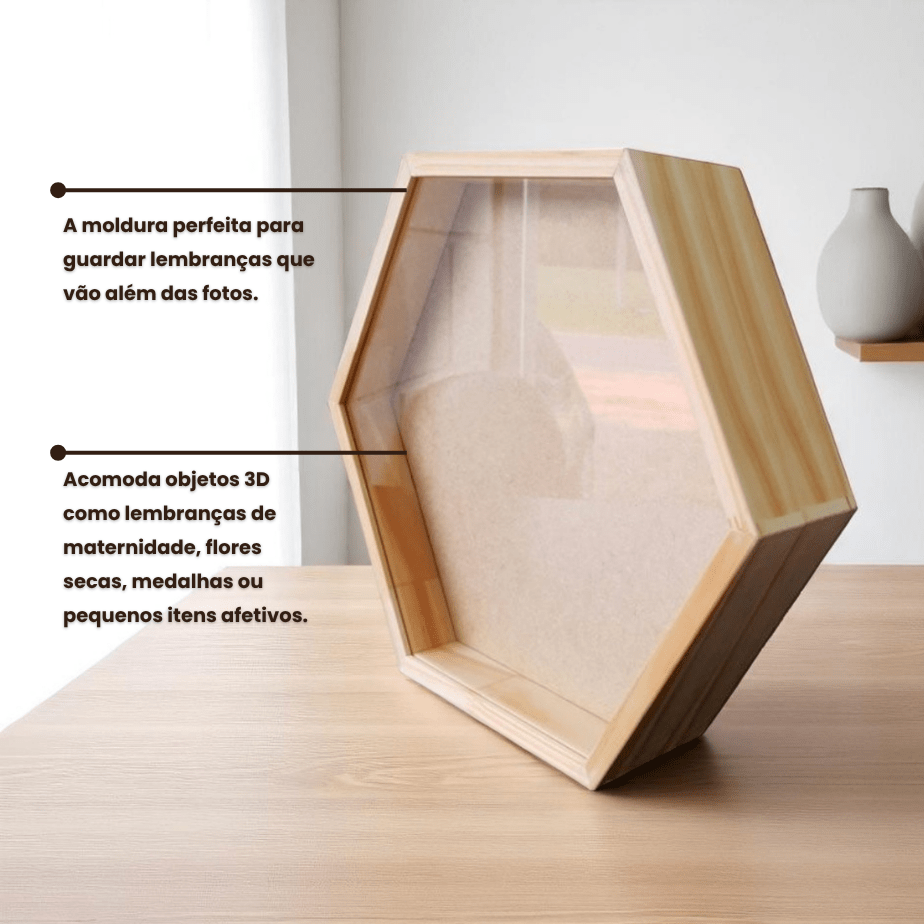 Moderna, ousada e cheia de personalidade, essa versão traz dinamismo à decoração, transformando qualquer composição em um verdadeiro ponto focal. O formato hexagonal é perfeito para criar galerias criativas, mosaicos afetivos ou destacar peças únicas com um visual contemporâneo e inspirador.