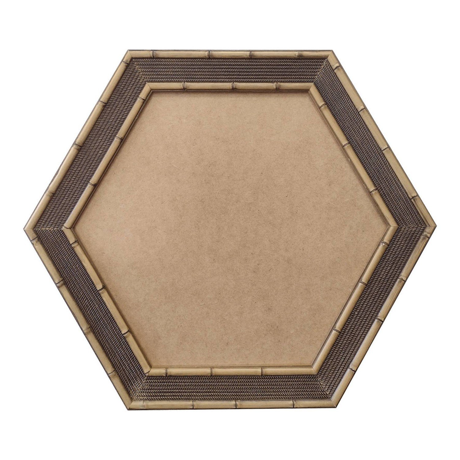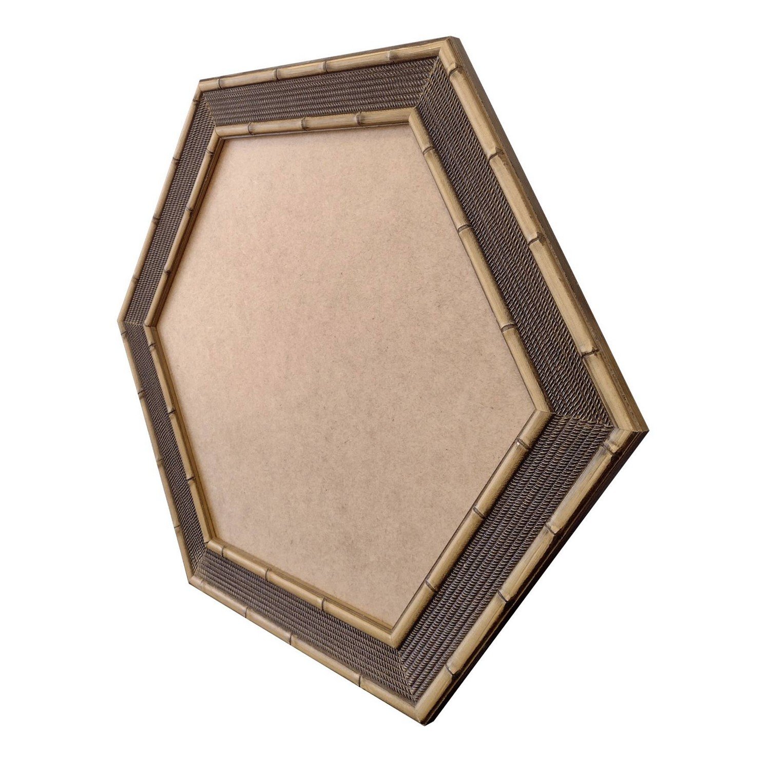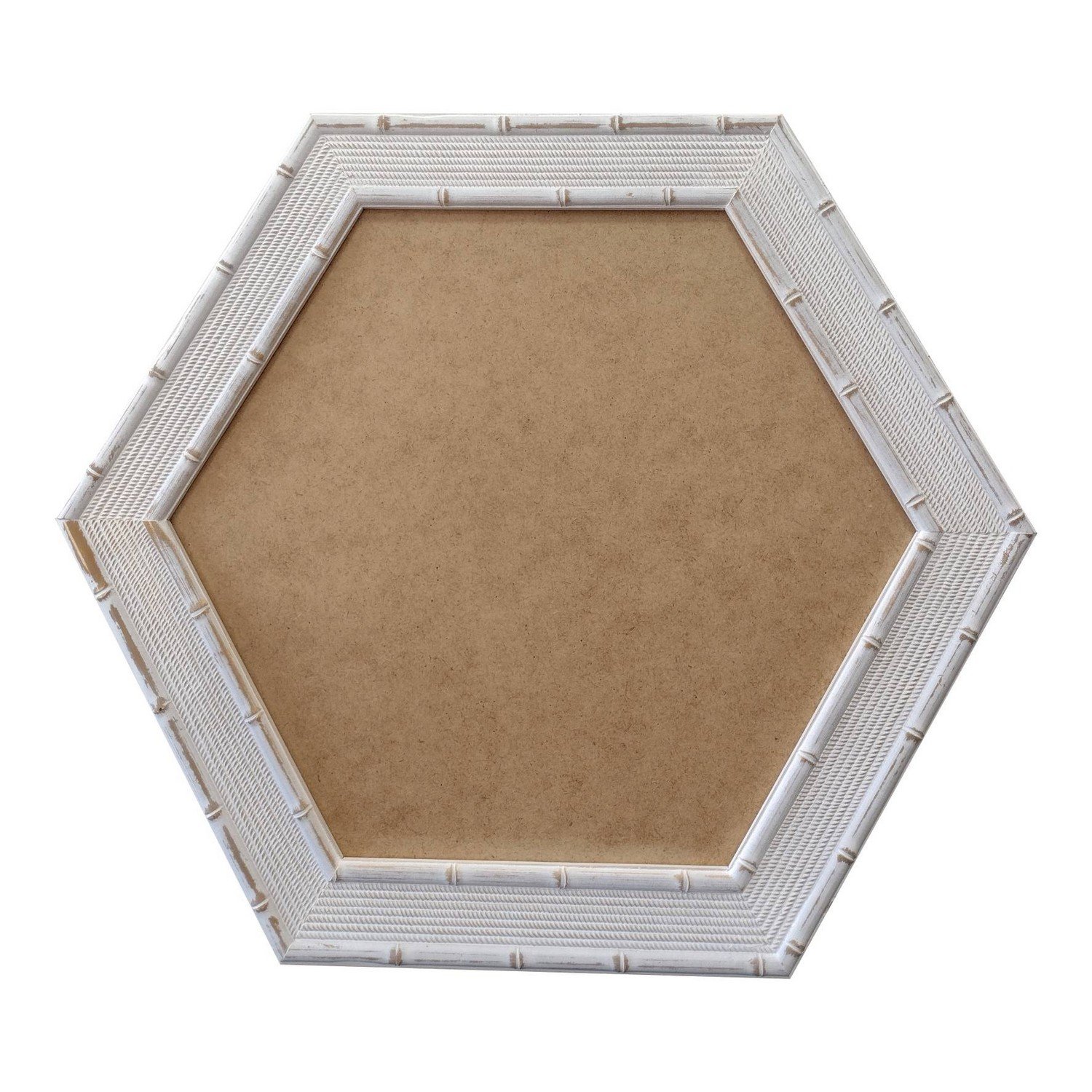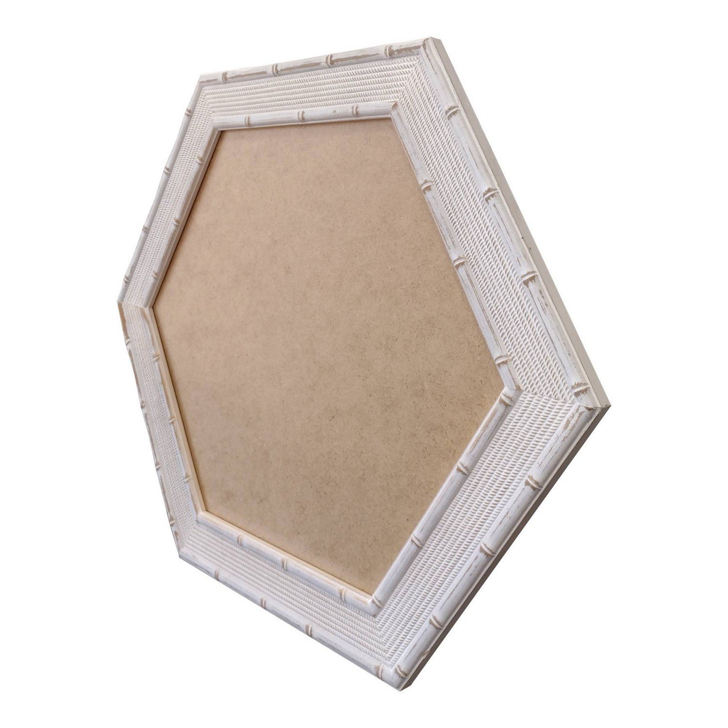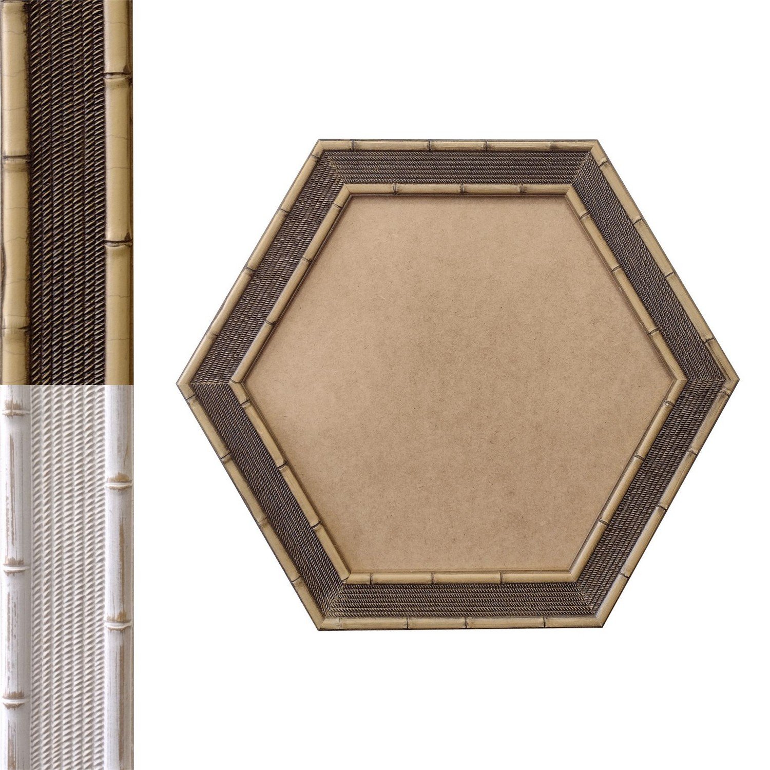 Moldura Hexagonal com Gravação para Espelhos ou Quadros de parede. Essa moldura possui gravação diretamente sobre a madeira, recebe uma leve camada de gesso e depois é laqueada.