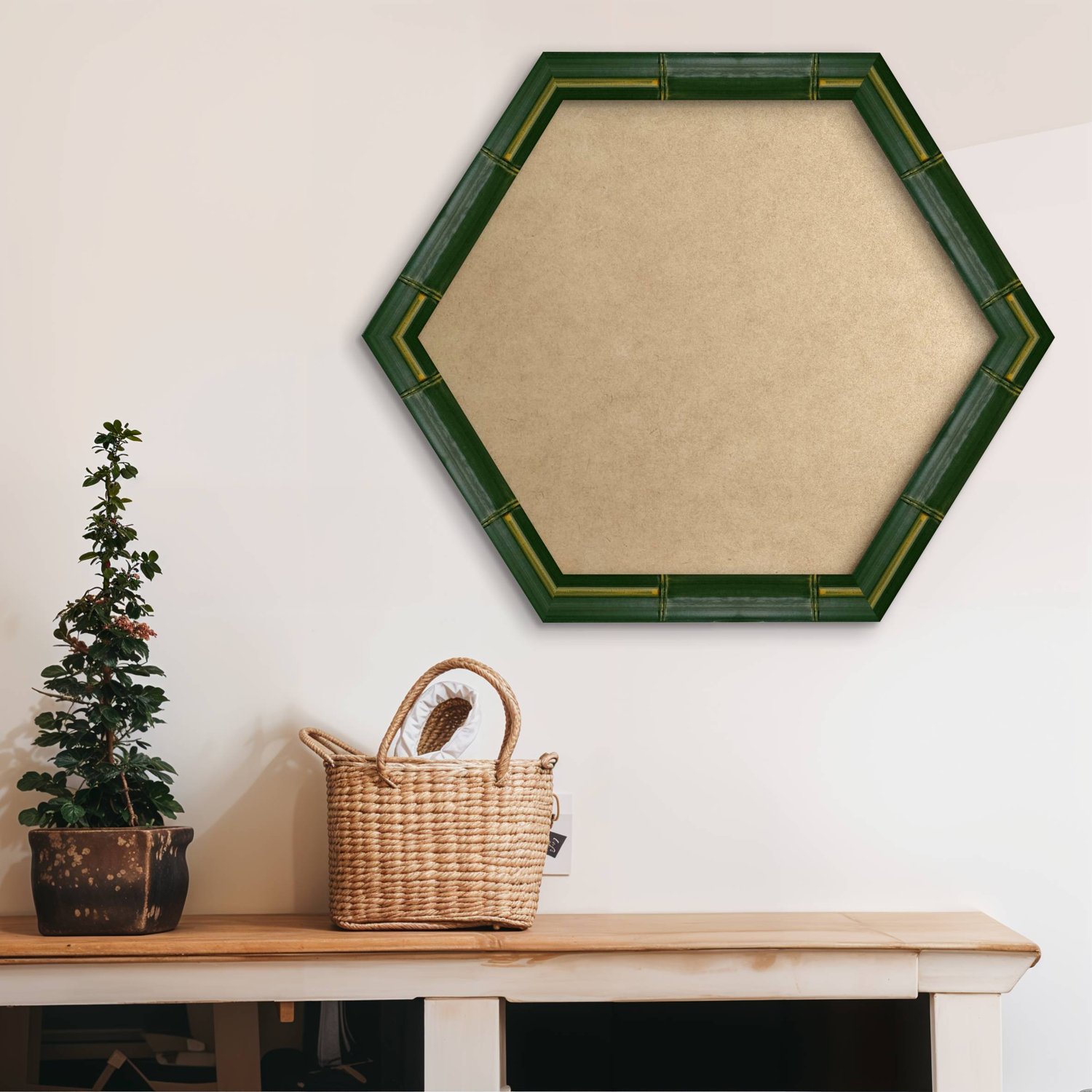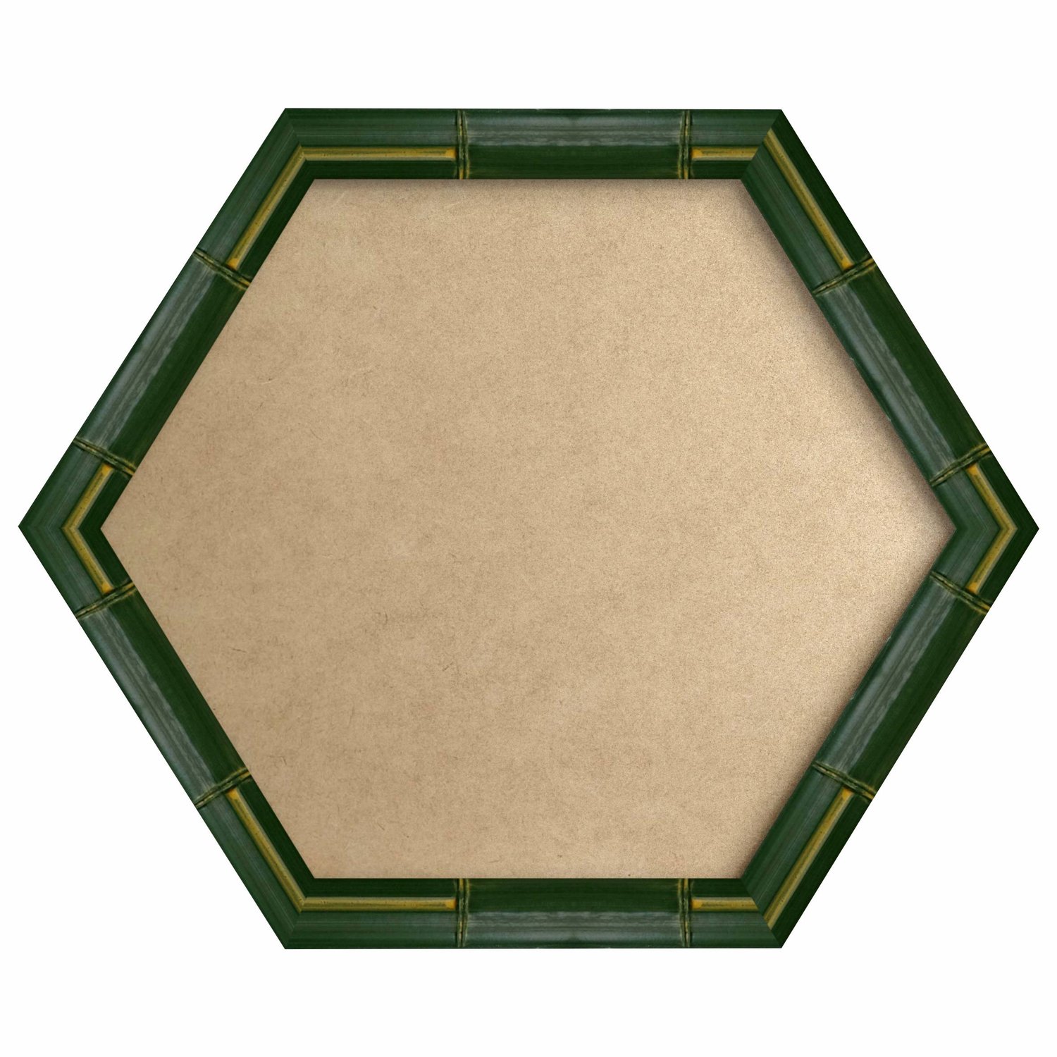Moldura Hexagonal com Gravação de Bambu para Quadros e Fotos de parede. Essa moldura possui gravação diretamente sobre a madeira, recebe uma leve camada de gesso e depois é laqueada.