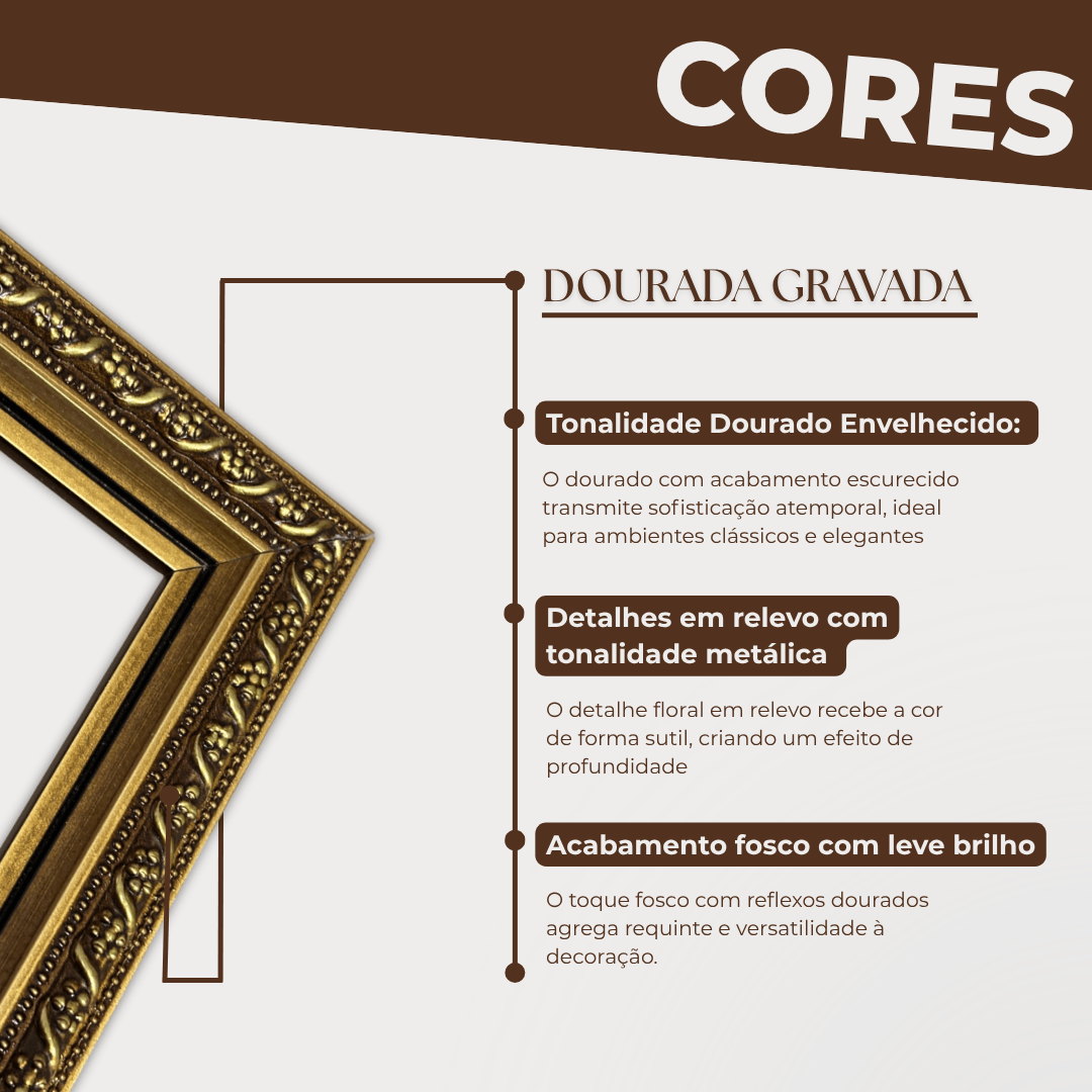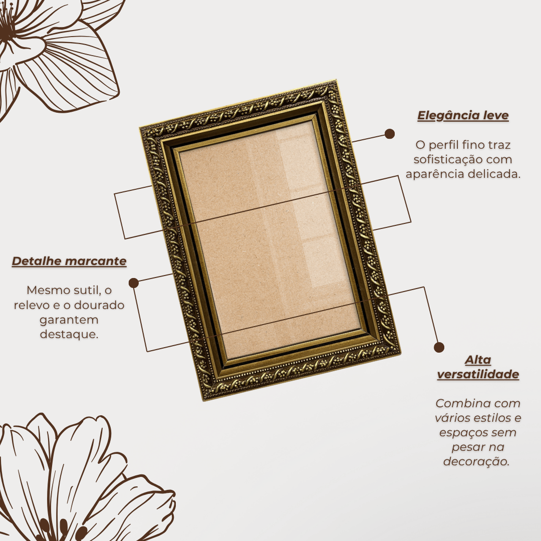 Dê vida às suas paredes com a moldura decorativa dourada que é puro requinte! Nossa moldura com gravação floral em alto relevo é a escolha perfeita para quem deseja destacar fotos, quadros e pôsteres com um toque de sofisticação clássica.