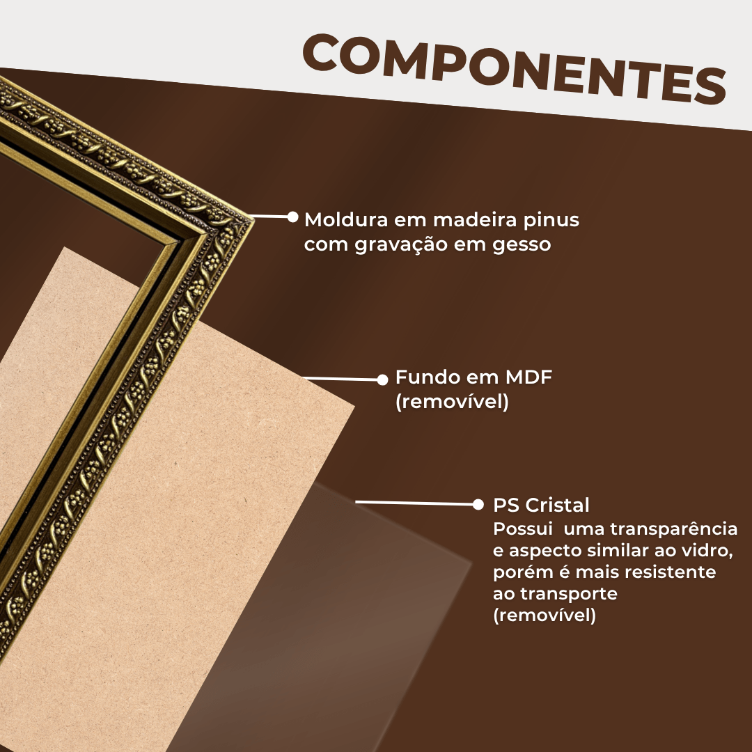 Material: Moldura em madeira pinus com gravação em gesso, fundo em mdf 3mm e frente em PS Cristal (o PS tem uma transparência e aspecto similar ao vidro, como ponto positivo, o PS é mais resistente ao transporte);