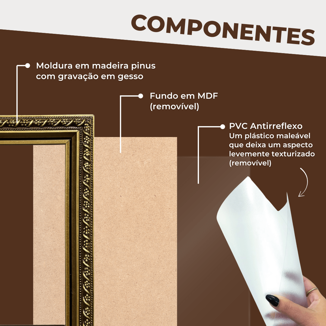 Material: Moldura em madeira pinus com gravação em gesso, fundo em mdf 3mm e frente em PVC Antirreflexo (o PVC é maleável e substitui perfeitamente o acetato e o vidro, deixando um aspecto levemente texturizado);