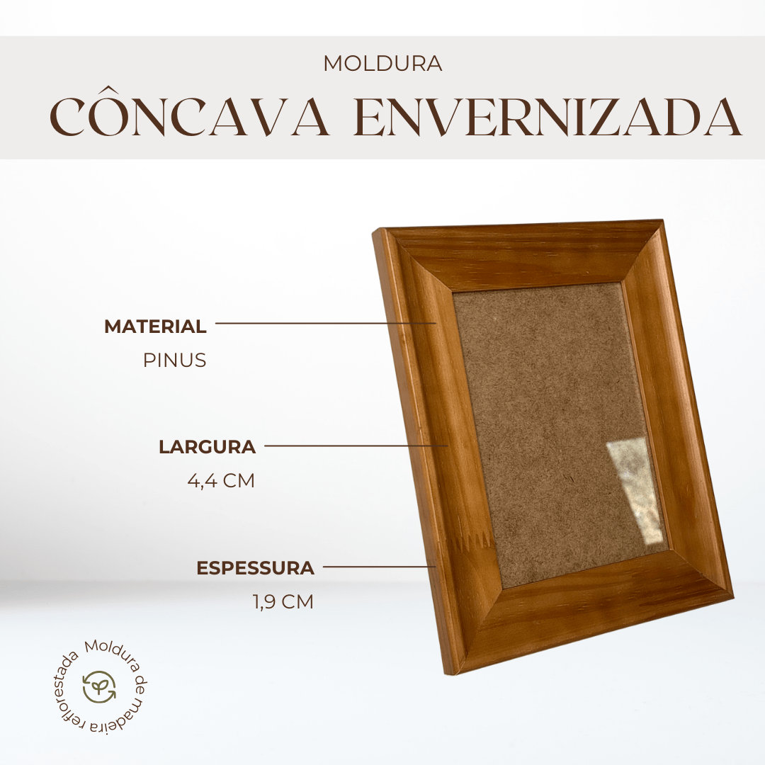 Material: Moldura em madeira pinus envernizada, fundo MDF 3mm e frente em acetato (o acetato é um plástico maleável) para proteção da imagem;