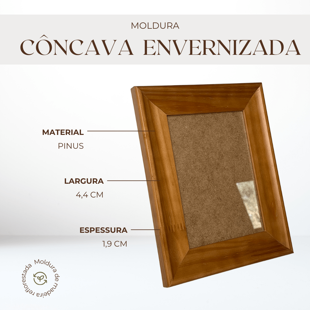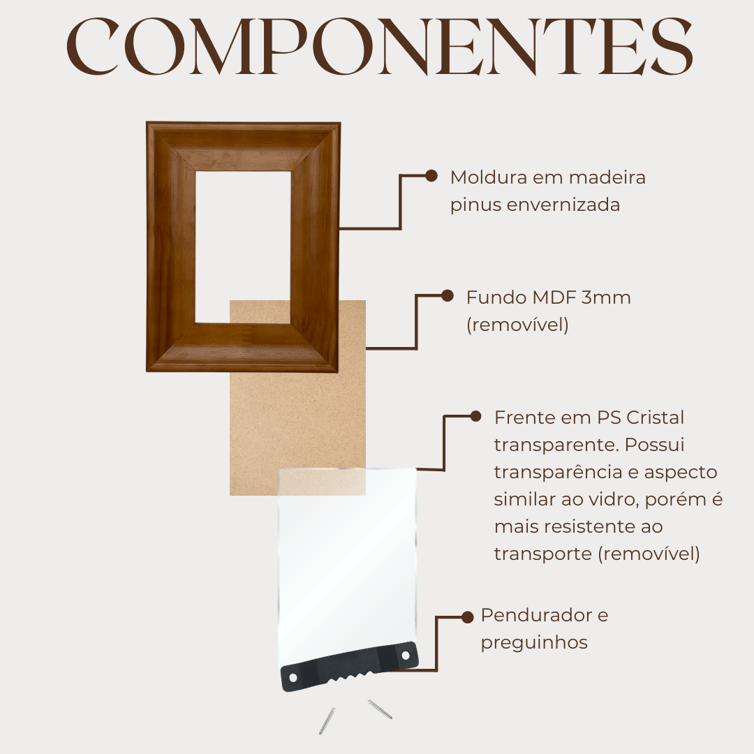 Material: Moldura em madeira pinus envernizada, fundo em MDF 3mm e frente em PS Cristal transparente para proteção da imagem (O PS tem uma transparência e aspecto similar ao vidro, como ponto positivo, o PS é mais resistente ao transporte);
