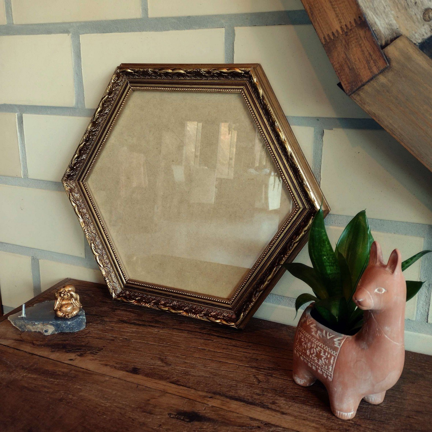 Moldura Dourada Hexagonal com Gravação para Espelhos ou Quadros de parede. Essa moldura possui gravação diretamente sobre a madeira, recebe uma leve camada de gesso e depois é laqueada.