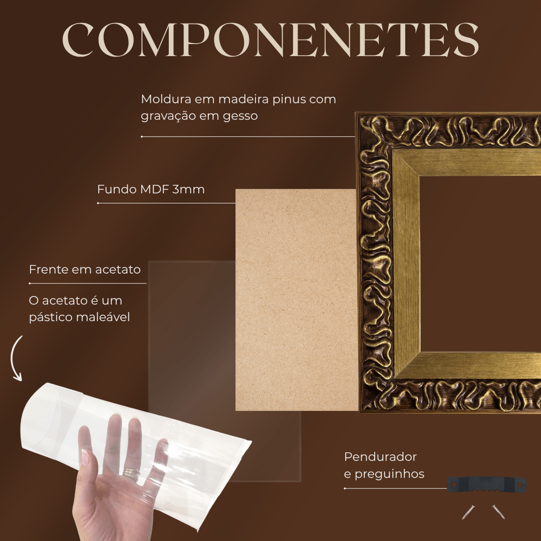 Material: Moldura em madeira pinus com gravação em gesso, fundo MDF 3mm e frente em acetato (o acetato é um plástico maleável);