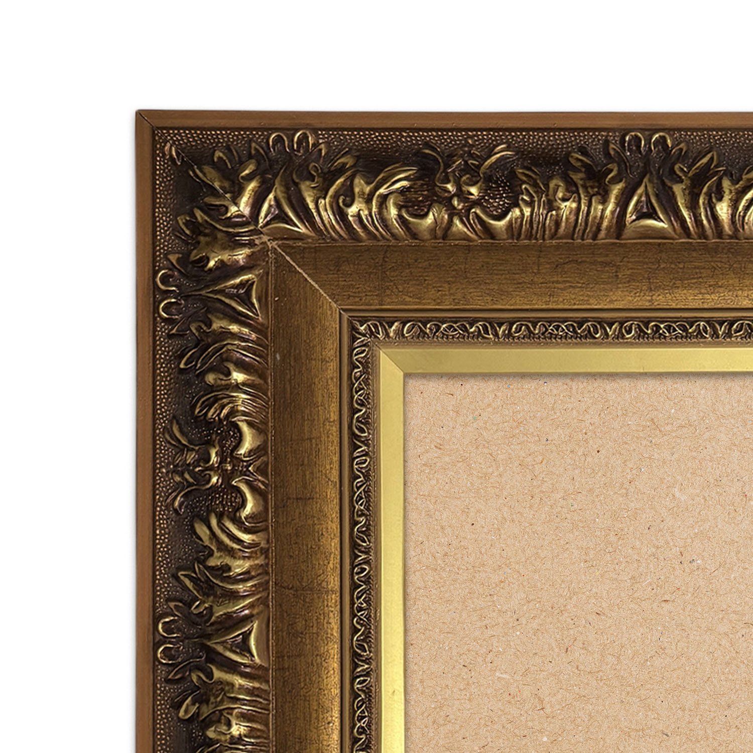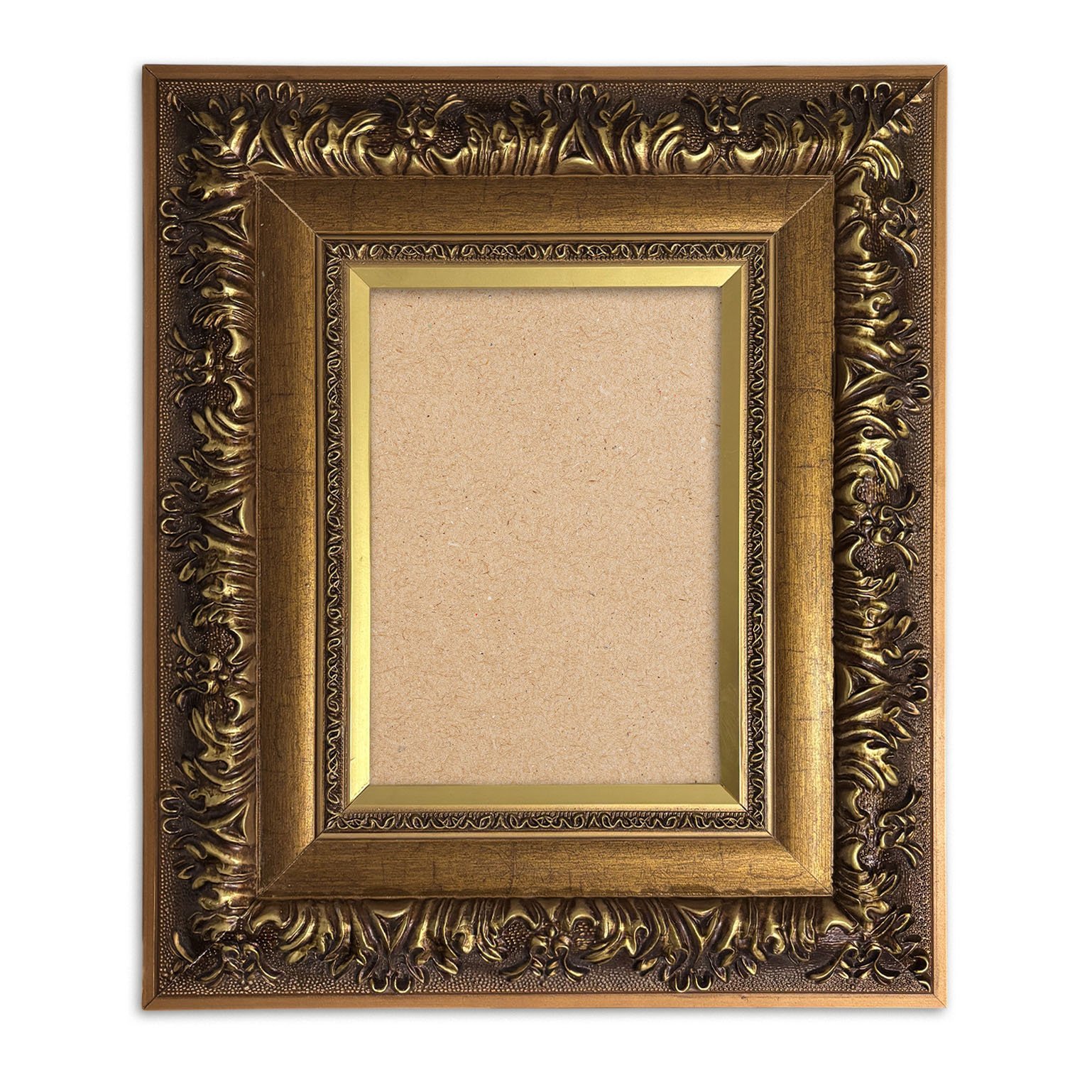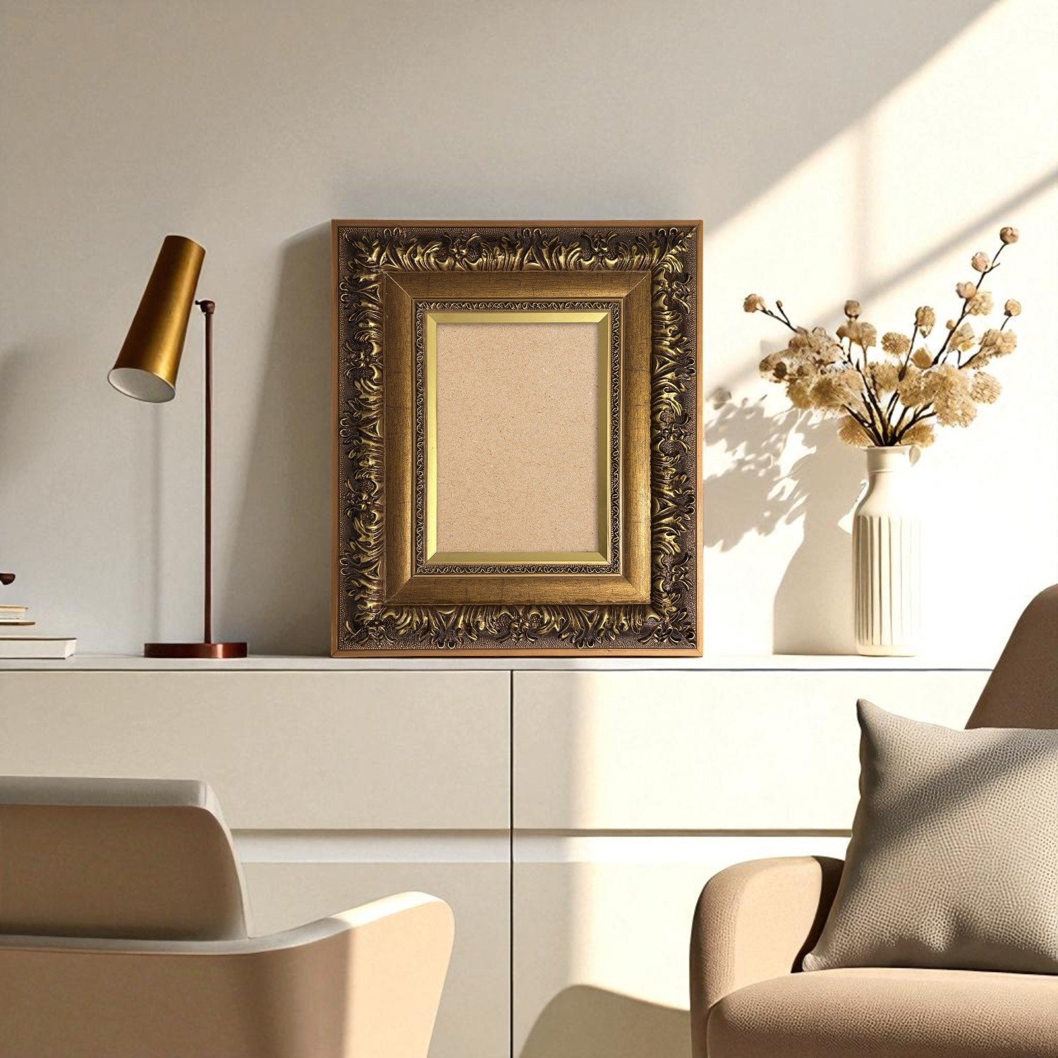 Moldura Estilo Renascentista com Perfil Interno Liso Chanfrado e Externo com Gravação Ornamental Efeito Metálico para Quadros e Fotos com Fundo Mdf - 9,2x2,7