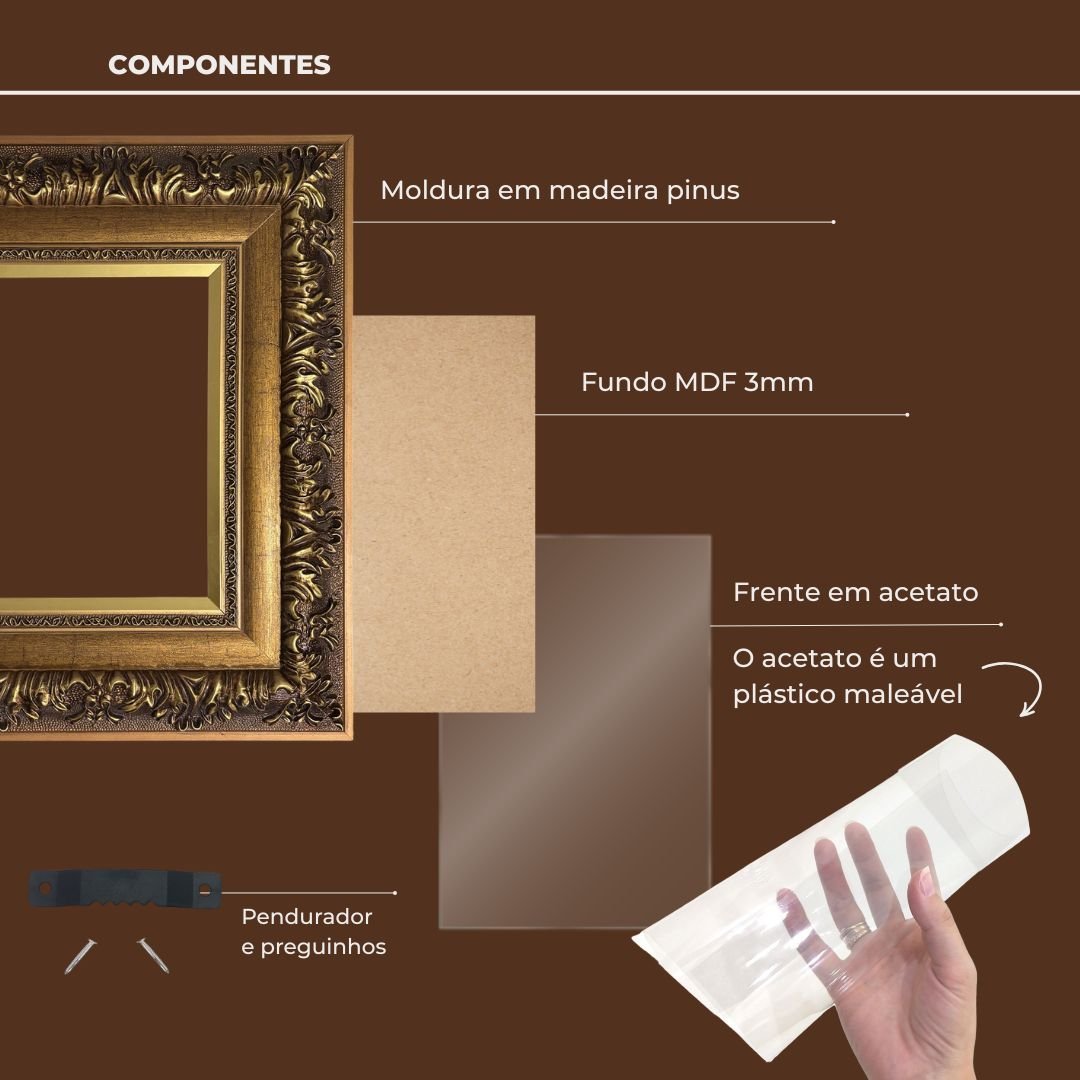 Material: Moldura em madeira pinus com gravação em gesso, fundo mdf 3mm e frente em acetato (o acetato é um plástico maleável);