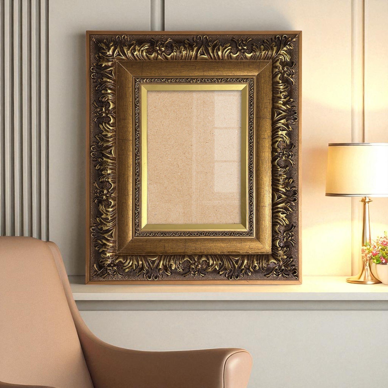 Moldura Estilo Renascentista com Perfil Interno Liso Chanfrado e Externo com Gravação Ornamental Efeito Metálico para Quadros e Fotos com Fundo Mdf e Acetato - 9,2x2,7