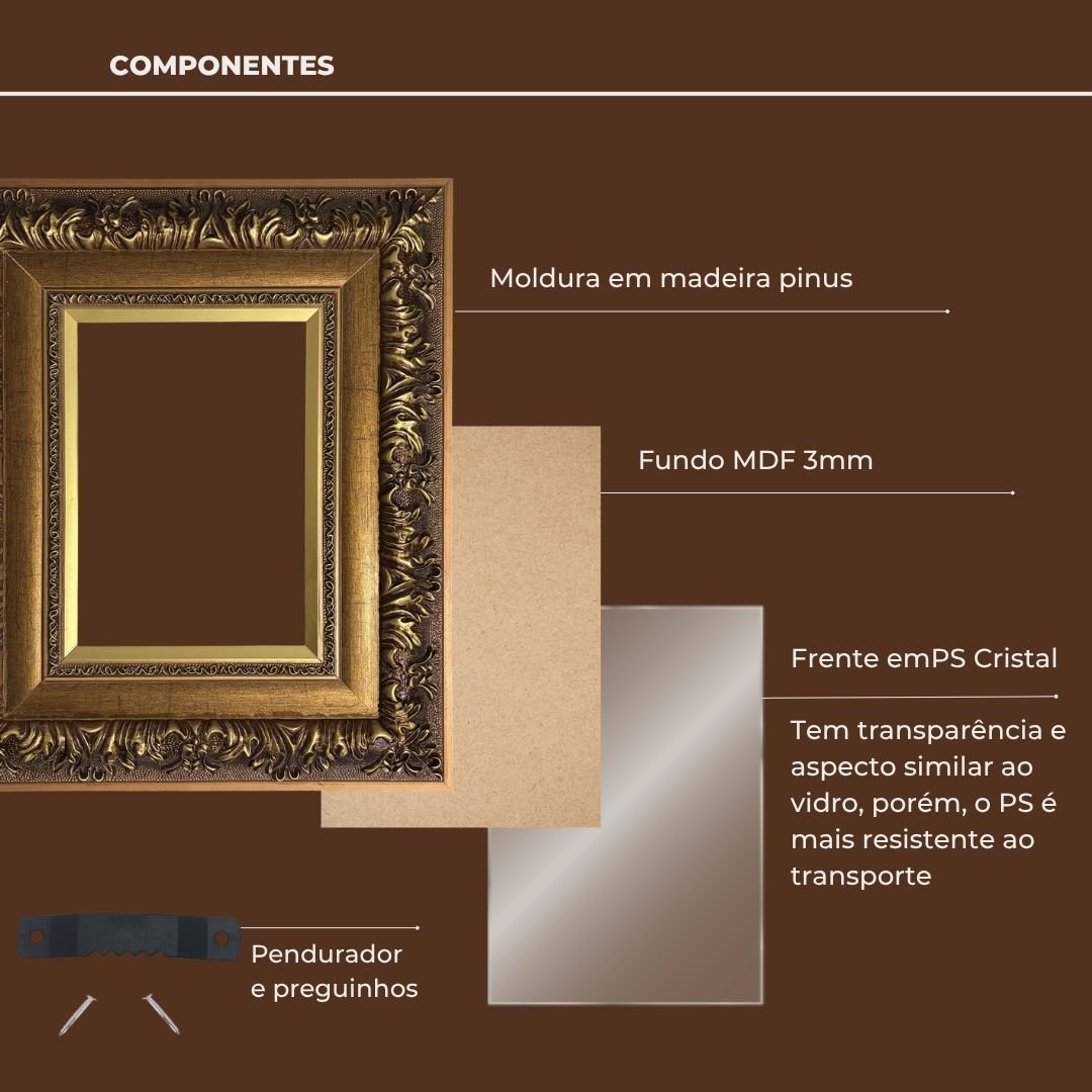 Material: Moldura em madeira pinus com gravação em gesso, fundo mdf 3mm e frente em PS Cristal transparente (o PS tem uma transparência e aspecto similar ao vidro, como ponto positivo, o PS é mais resistente ao transporte);