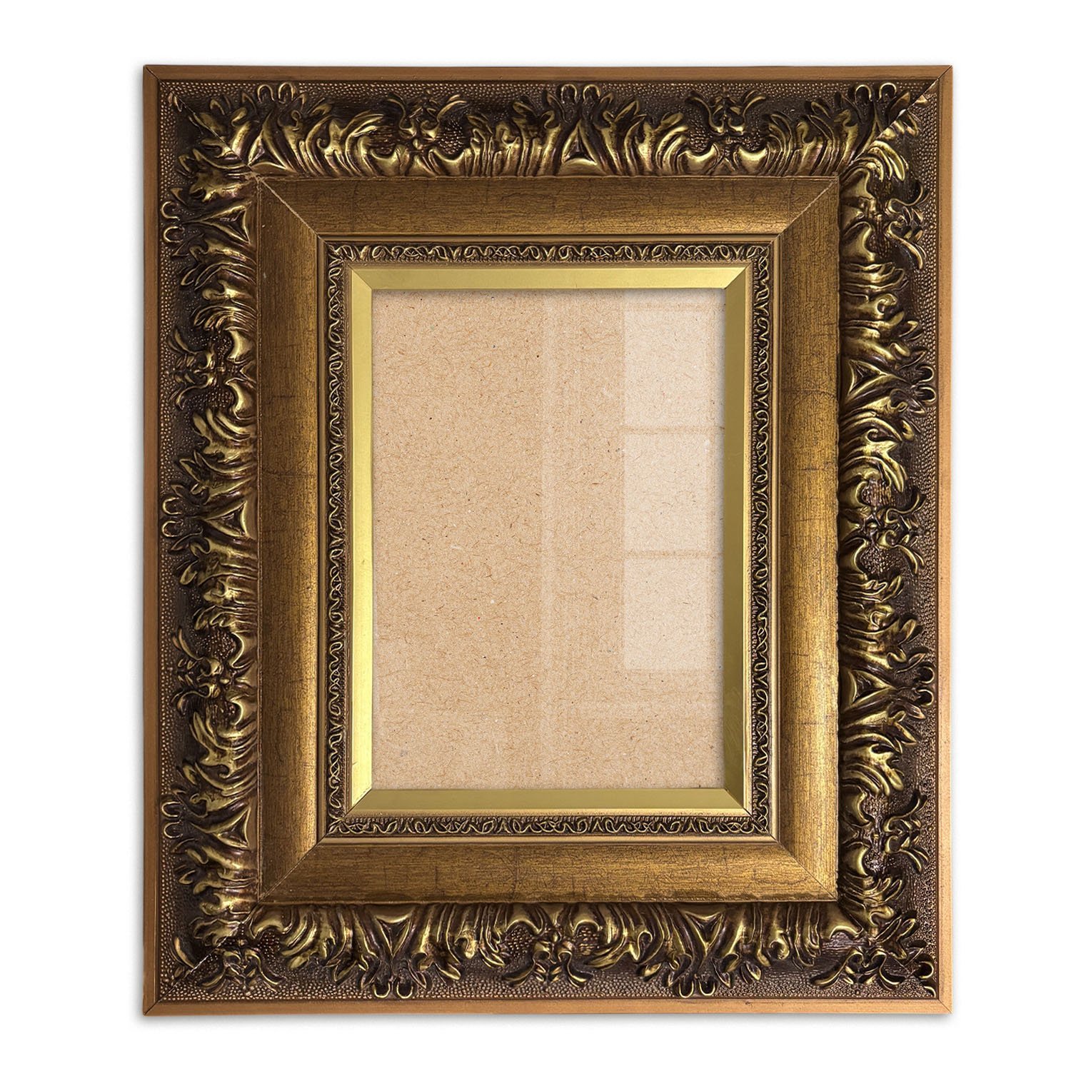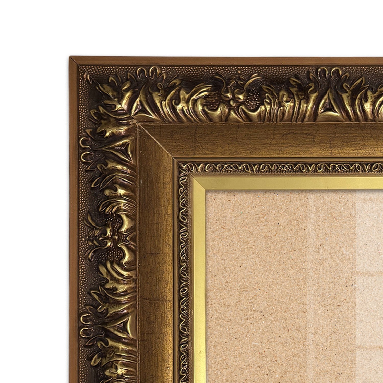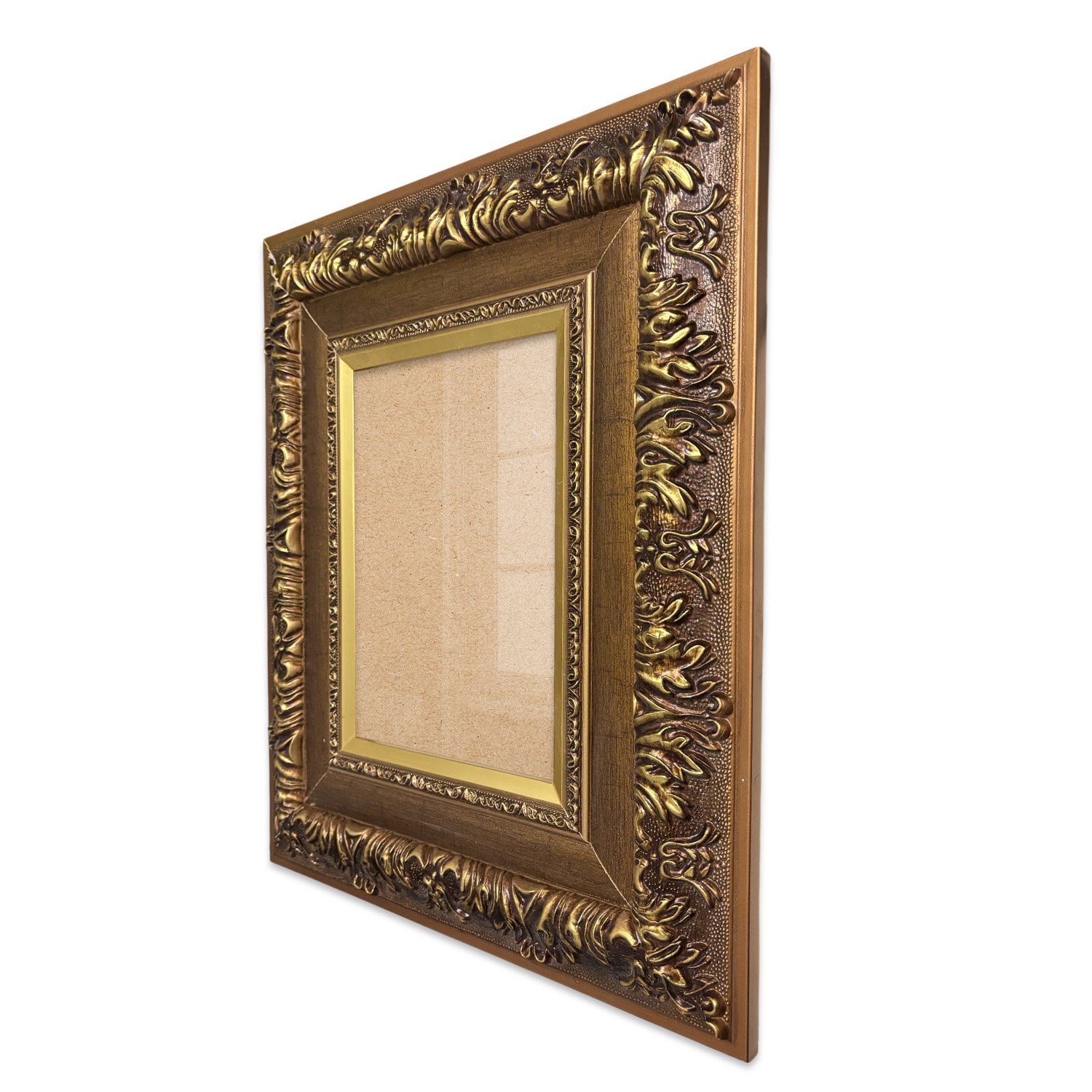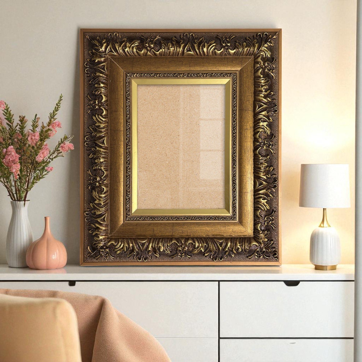 Moldura Estilo Renascentista com Perfil Interno Liso Chanfrado e Externo com Gravação Ornamental Efeito Metálico para Quadros e Fotos com Fundo Mdf e PS Cristal Transparente - 9,2x2,7