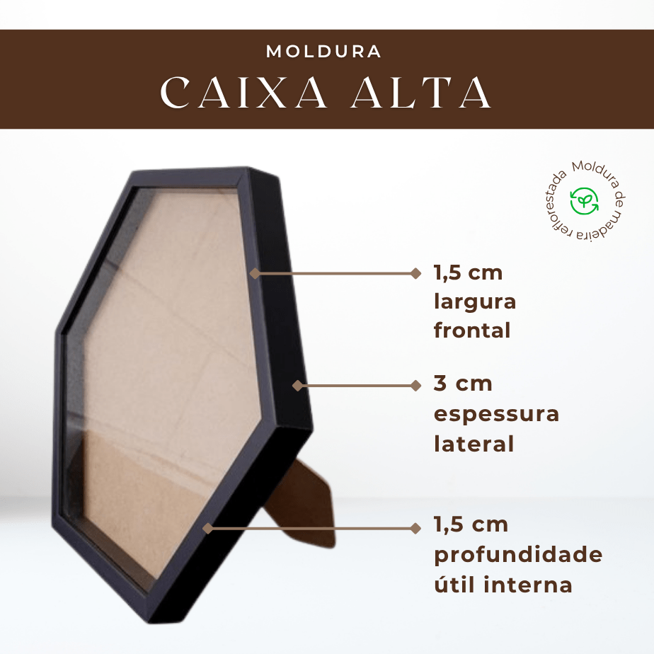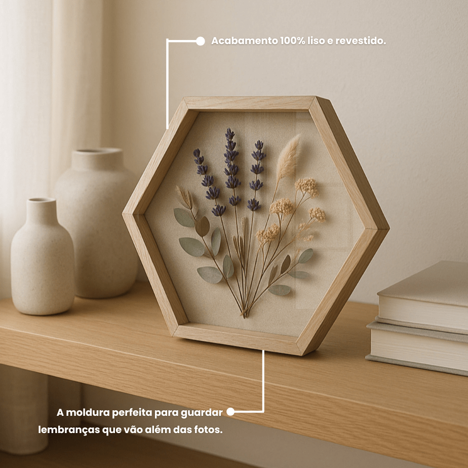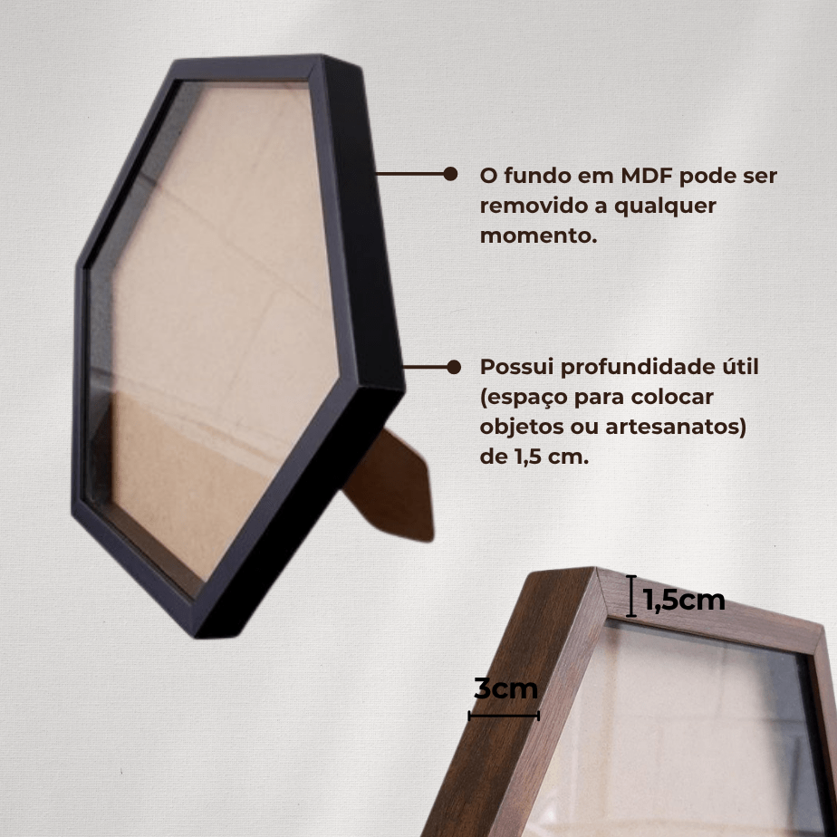 Moderna, ousada e cheia de personalidade, essa versão traz dinamismo à decoração, transformando qualquer composição em um verdadeiro ponto focal. O formato hexagonal é perfeito para criar galerias criativas, mosaicos afetivos ou destacar peças únicas com um visual contemporâneo e inspirador.