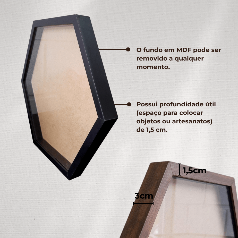 Moderna, ousada e cheia de personalidade, essa versão traz dinamismo à decoração, transformando qualquer composição em um verdadeiro ponto focal. O formato hexagonal é perfeito para criar galerias criativas, mosaicos afetivos ou destacar peças únicas com um visual contemporâneo e inspirador.