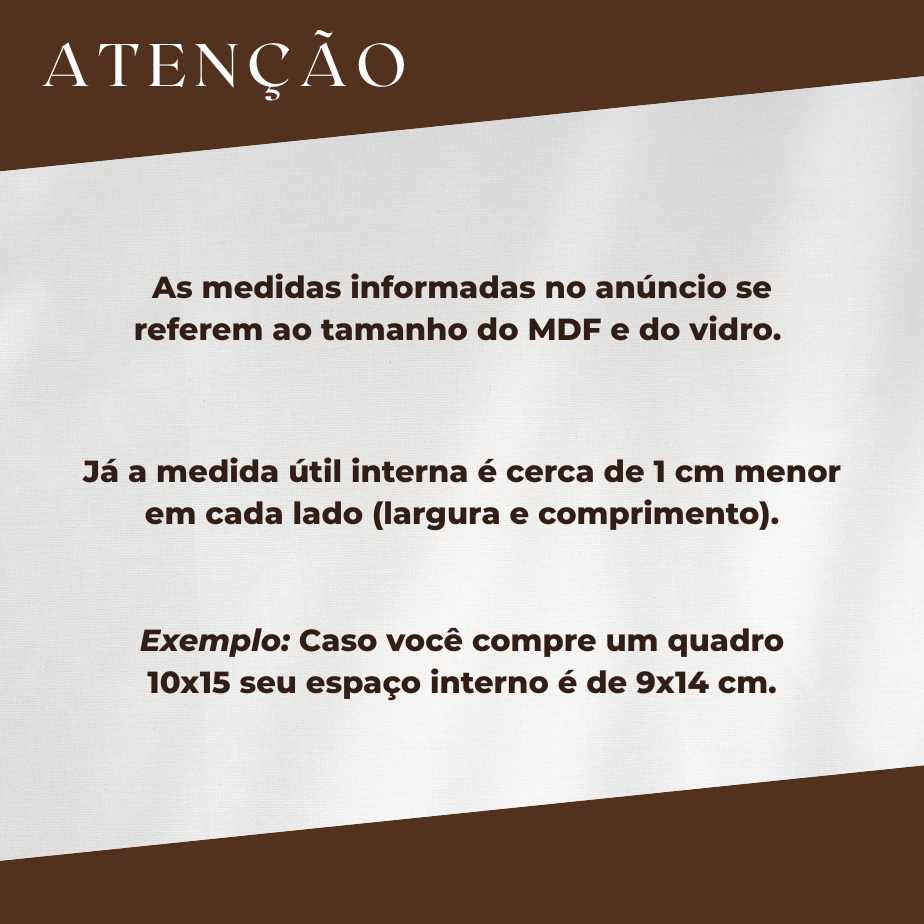 Largura e Comprimento da Moldura (cm): Veja as opções de tamanhos no anúncio, as medidas informadas são do fundo em mdf, a medida útil interna é em torno de 1cm menor em cada lado, na largura e comprimento.