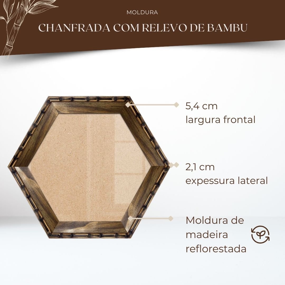 Imagine uma moldura que vai muito além da simples função de emoldurar uma imagem. Feita em madeira pinus de origem sustentável, nossa moldura hexagonal com relevo de bambu traz à sua decoração um toque de natureza, geometria e sensibilidade, transformando qualquer parede em uma verdadeira obra de arte.