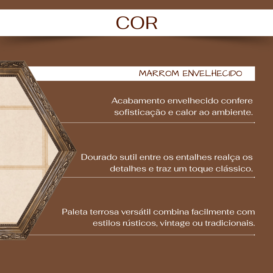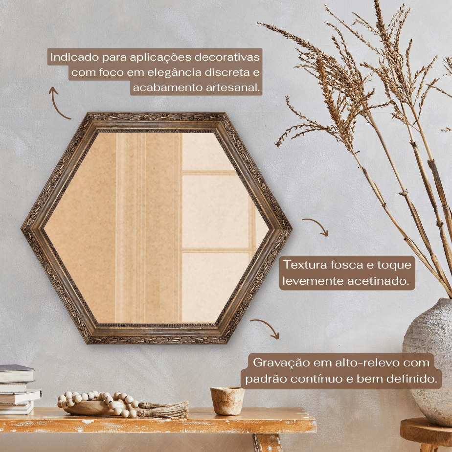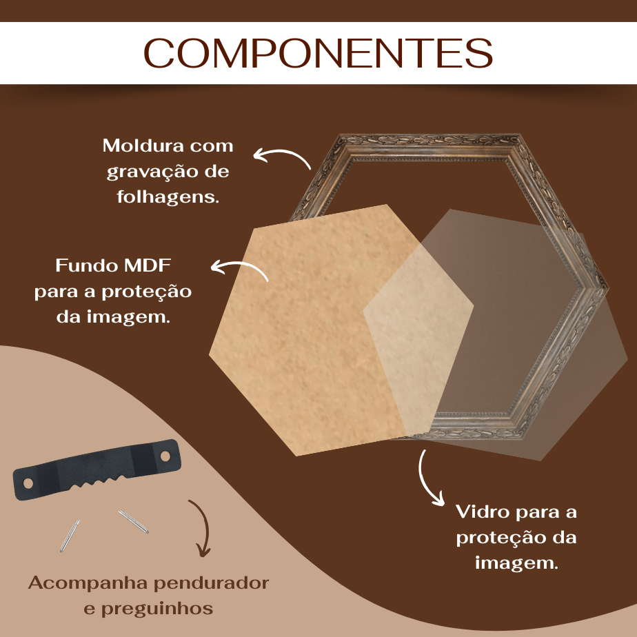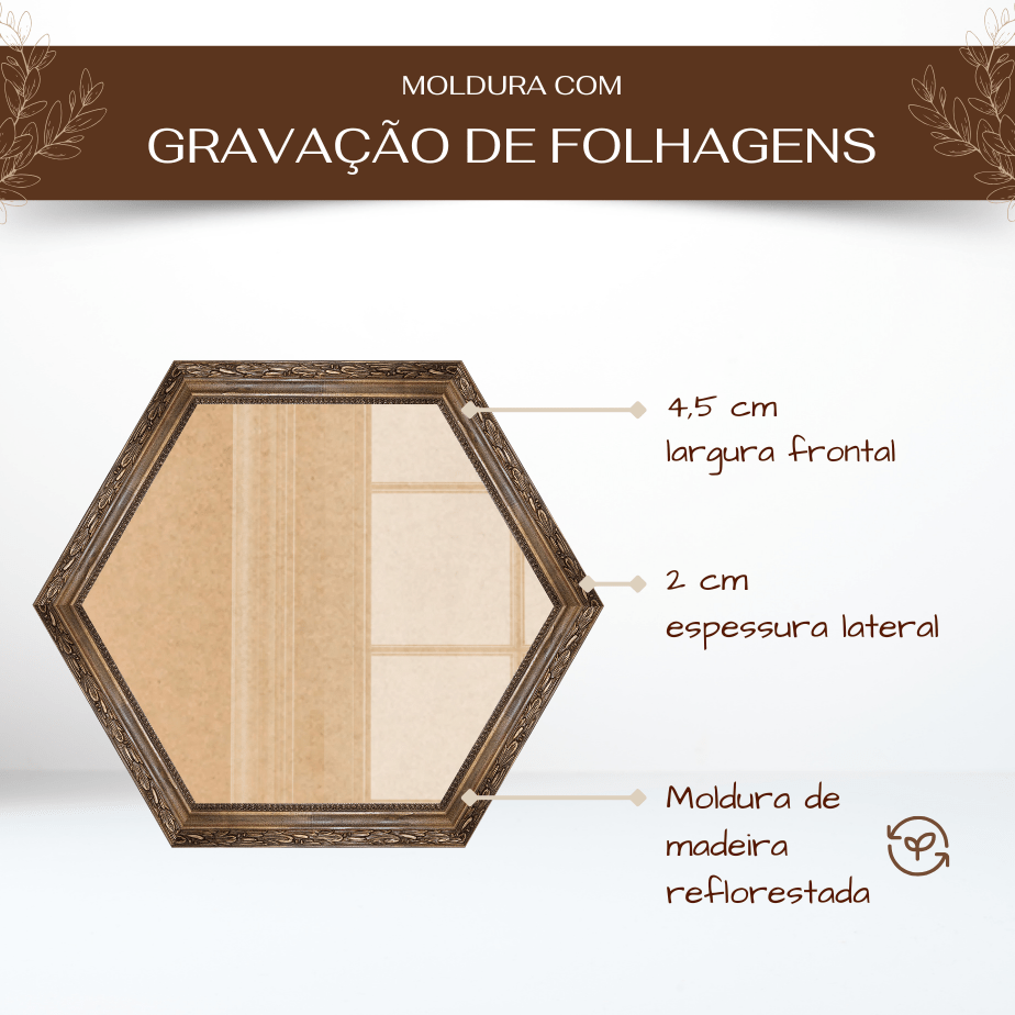 Moldura Hexagonal Com Gravação de Folhagens Com Fundo MDF E Frente Em Vidro - 4,5x2