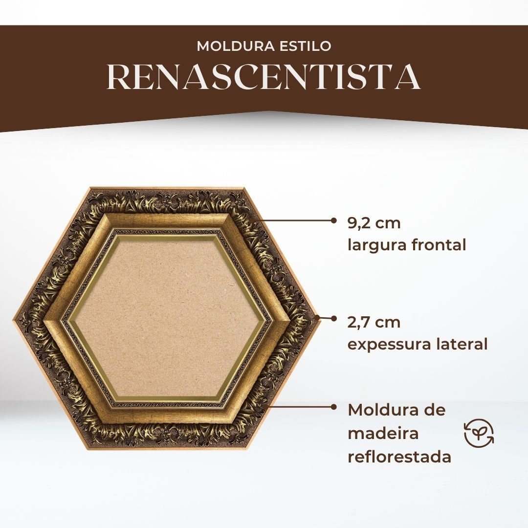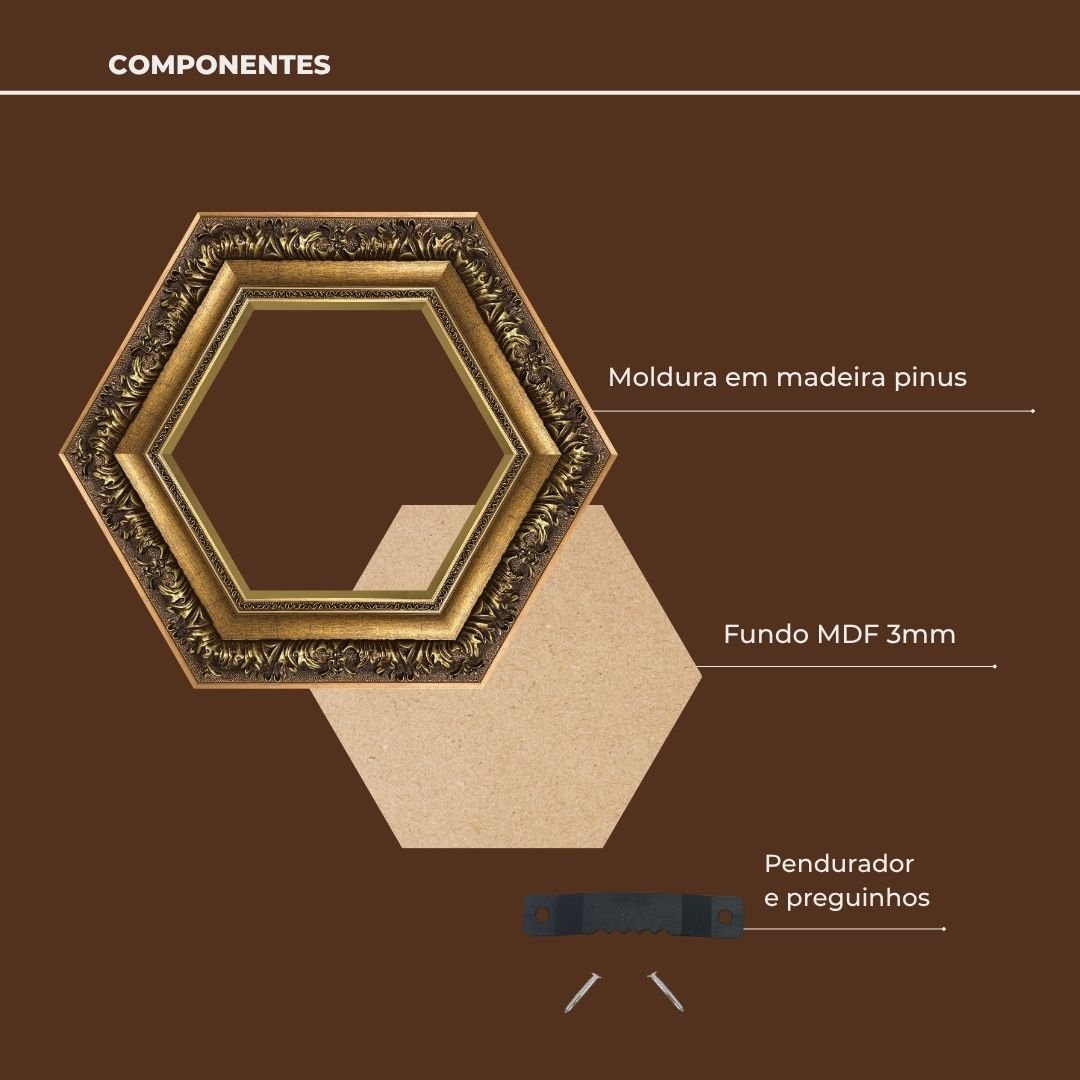 Com um design hexagonal exclusivo, esta moldura quebra a rigidez do tradicional retângulo e traz uma geometria nobre e inusitada para o seu espaço. O perfil interno liso e chanfrado cria uma transição sutil e harmoniosa para a peça central, guiando o olhar com leveza. Já o perfil externo, com gravação ornamental minuciosamente trabalhada, remete aos detalhes arquitetônicos dos palácios europeus. O efeito metálico, aplicado com acabamento artístico, dá à moldura um brilho sutil, luxuoso, que muda levemente conforme a luz do ambiente um toque de sofisticação viva, que encanta sem exageros.