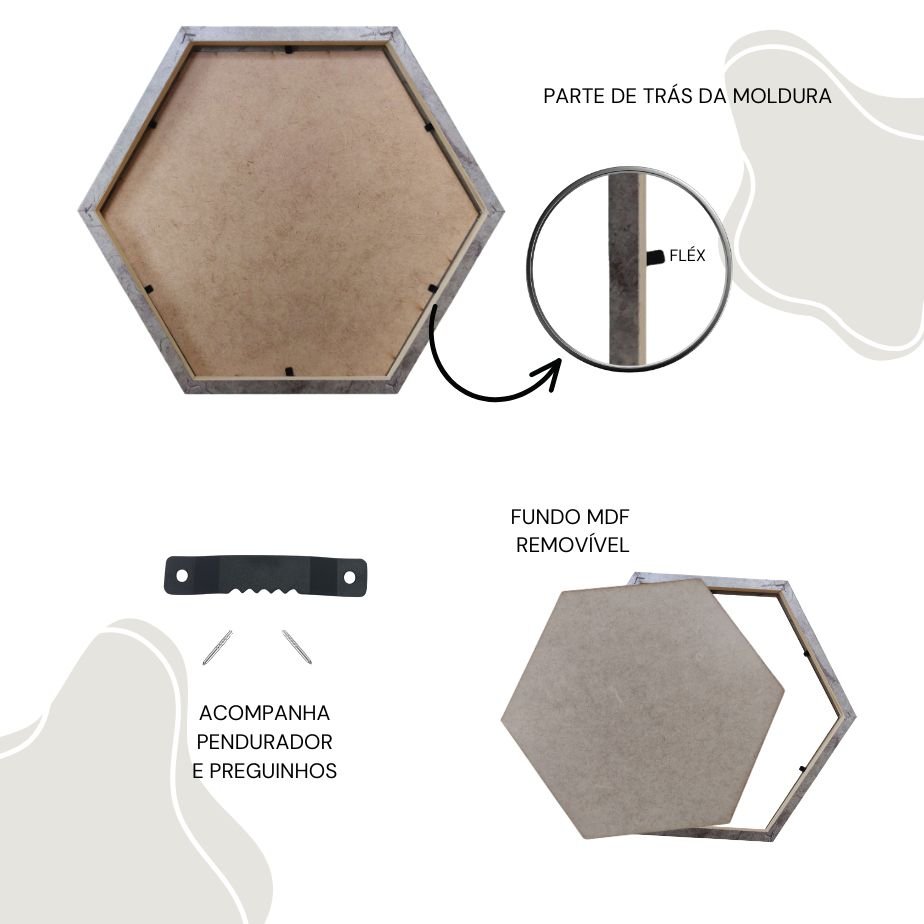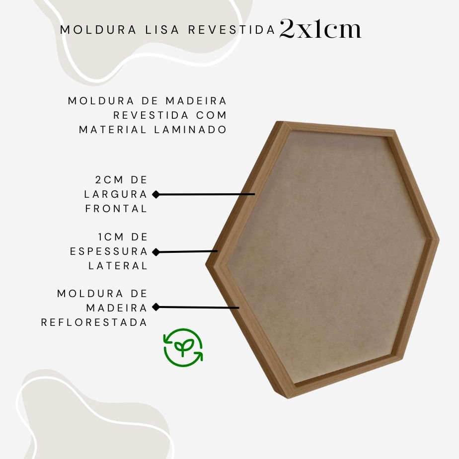 Moldura Hexagonal lisa para Quadros de parede revestidas com papel laminado, essas molduras possuem estilo clean que combinam facilmente com ambientes internos, valorizando as imagens nela inseridas. O revestimento em papel é altamente resistente, muito superior as molduras tradicionais em gesso, proporcionando assim alta durabilidade e beleza.