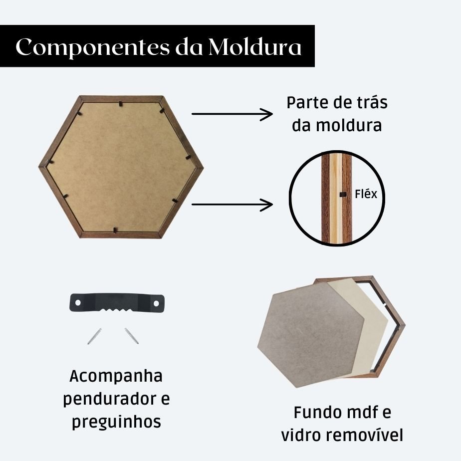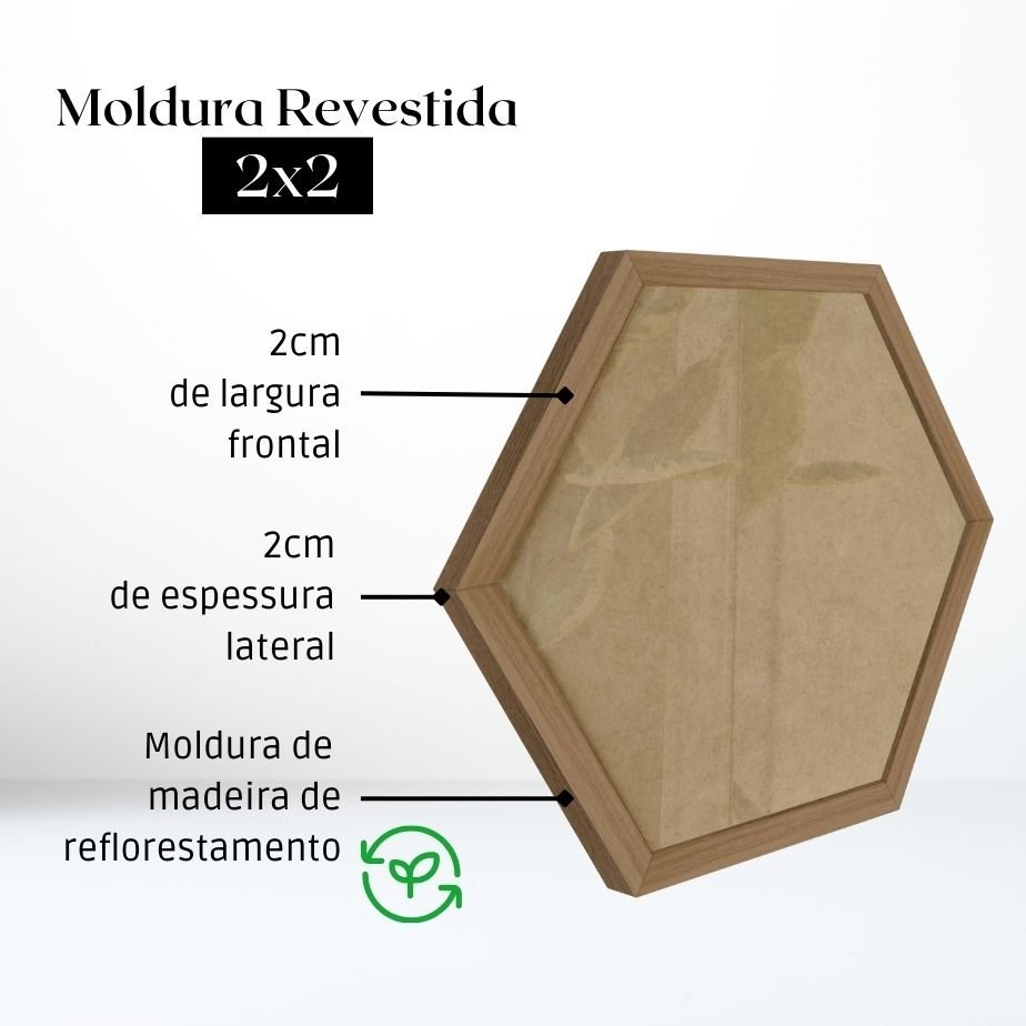 Moldura Hexagonal Lisa para Quadros de parede revestidas com processo de Laminação, essas molduras possuem estilo clean que combinam facilmente com ambientes internos, valorizando as imagens nela inseridas. O revestimento é altamente resistente, muito superior as molduras tradicionais em gesso, proporcionando assim alta durabilidade e beleza.