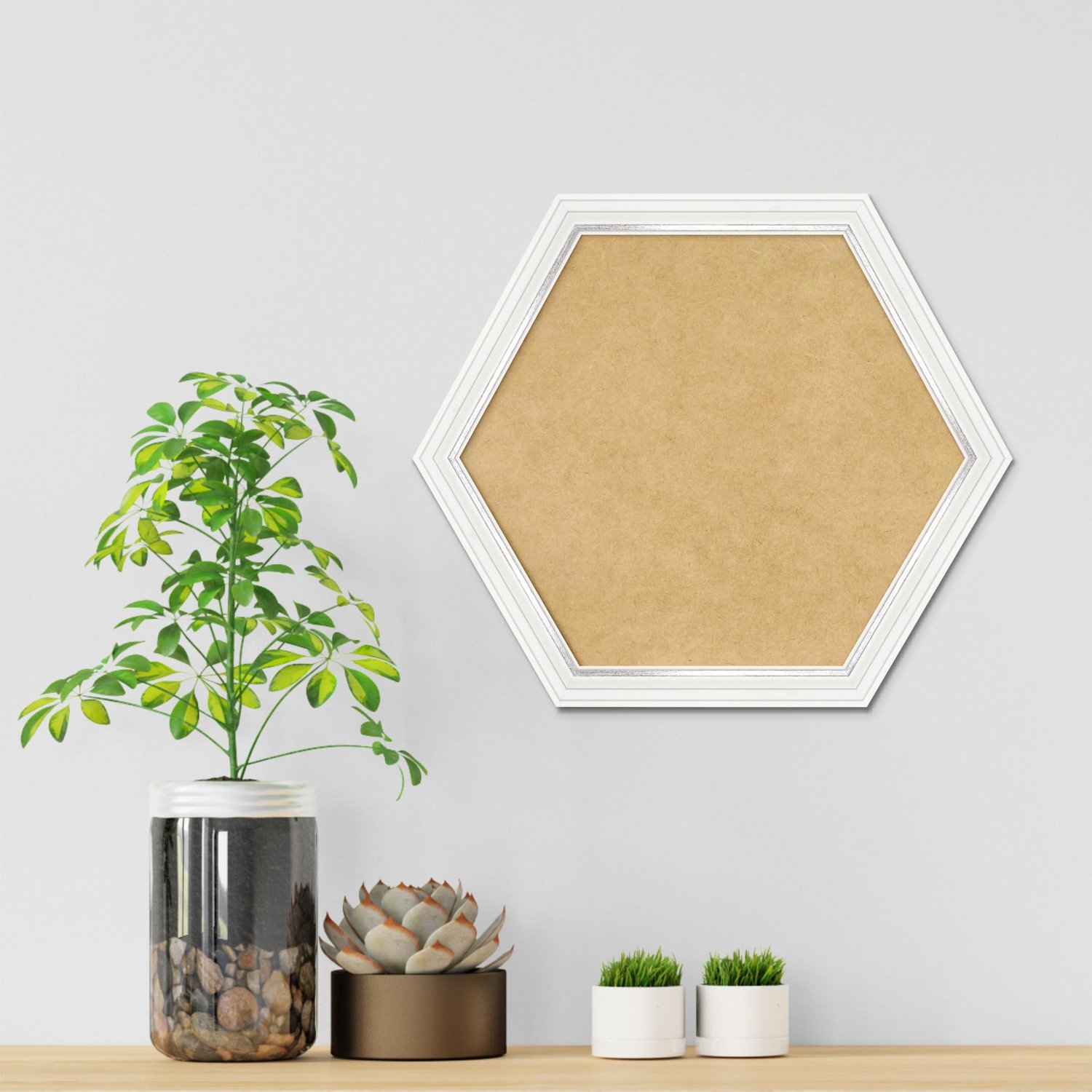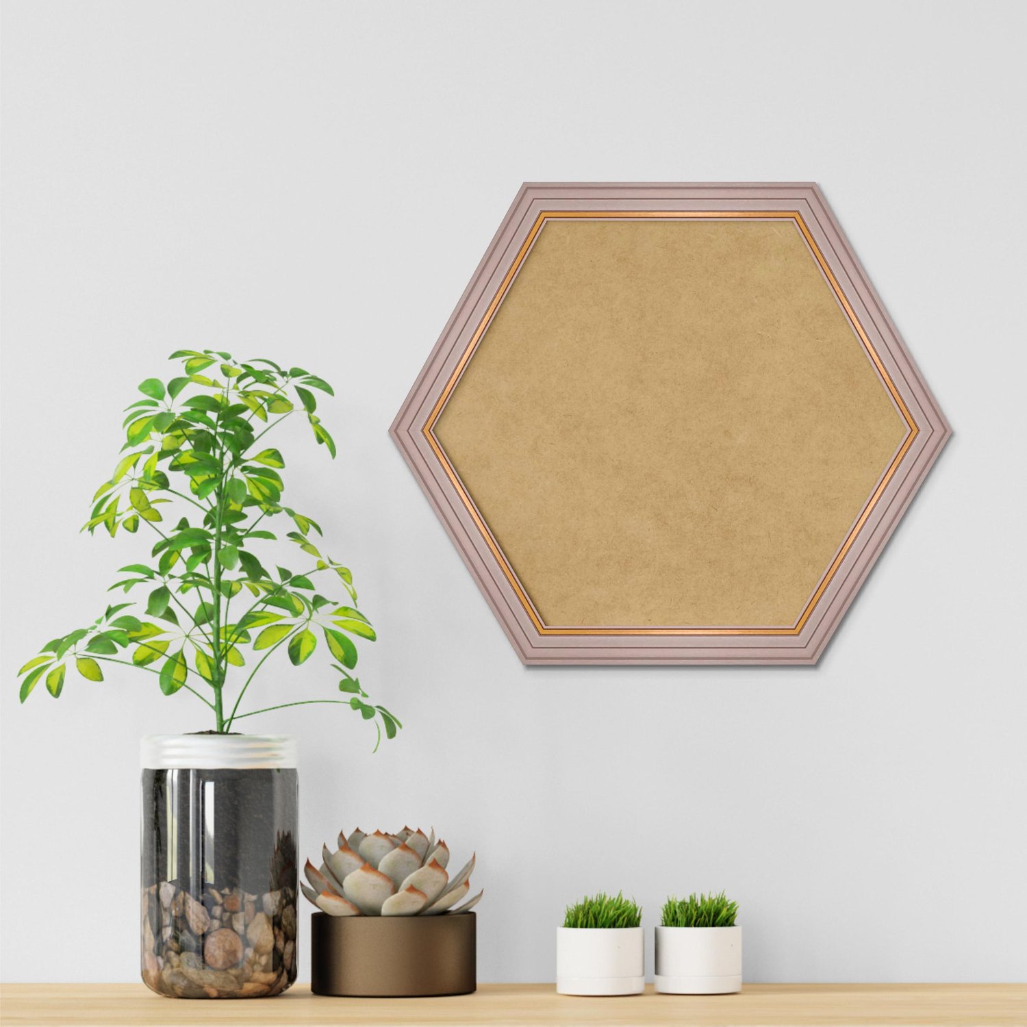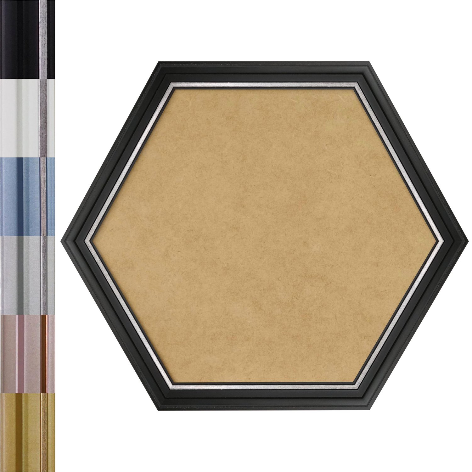 Moldura Hexagonal Micro Metalizada para Quadros de parede. Essa moldura recebe uma leve camada de gesso sobre a madeira e depois é laqueada.