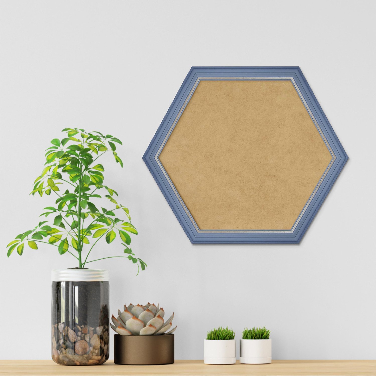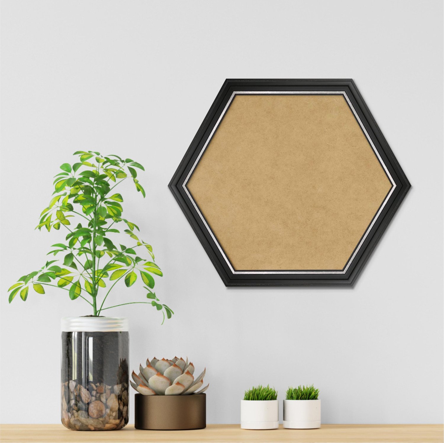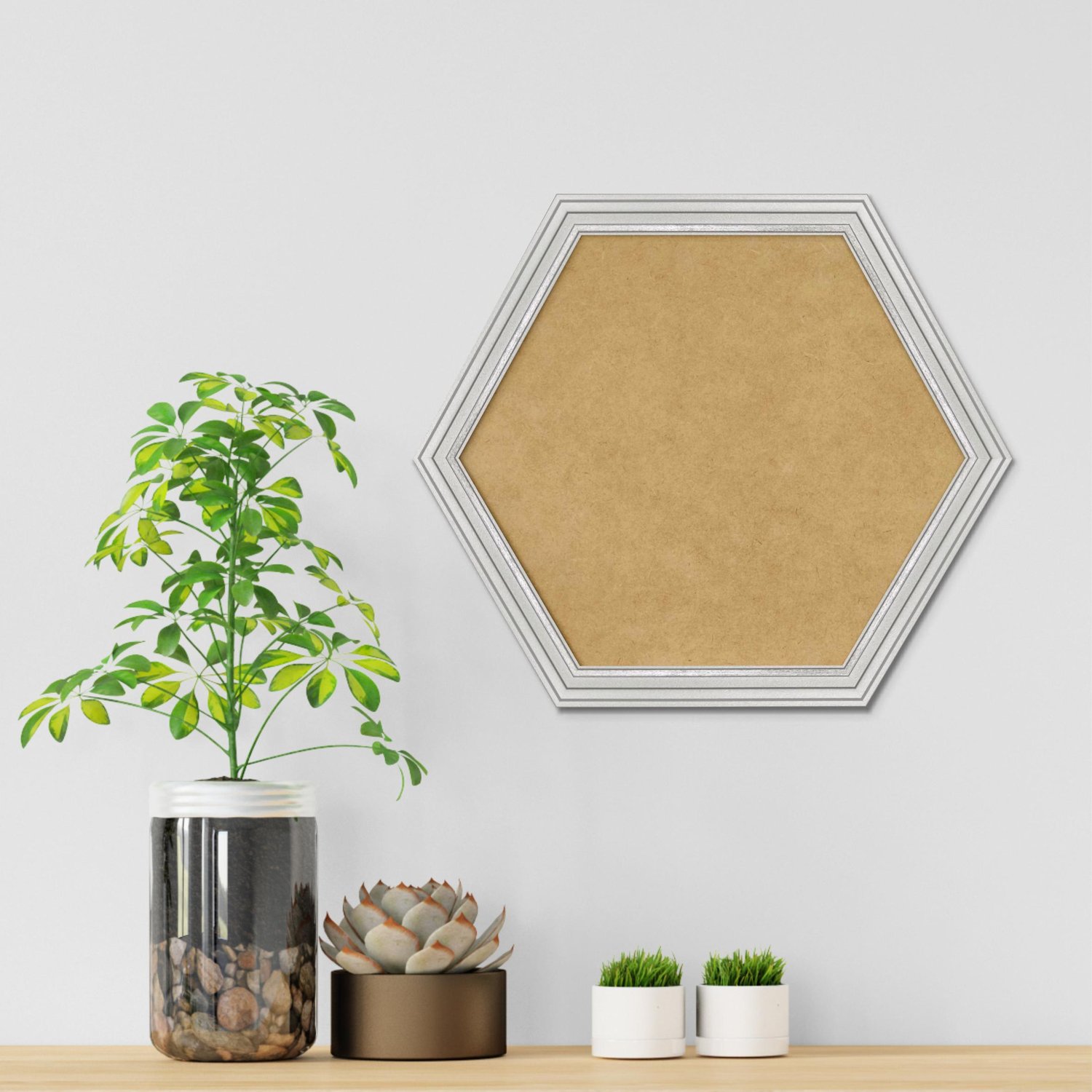 Moldura Hexagonal Micro Metalizada para Quadros de parede. Essa moldura recebe uma leve camada de gesso sobre a madeira e depois é laqueada.