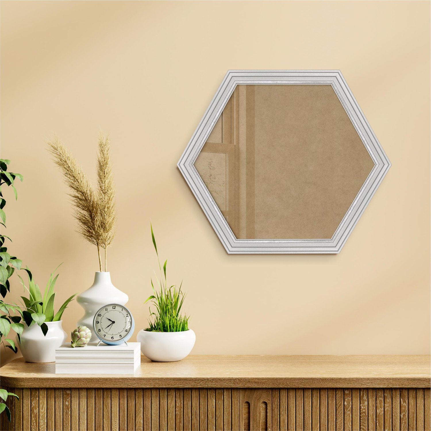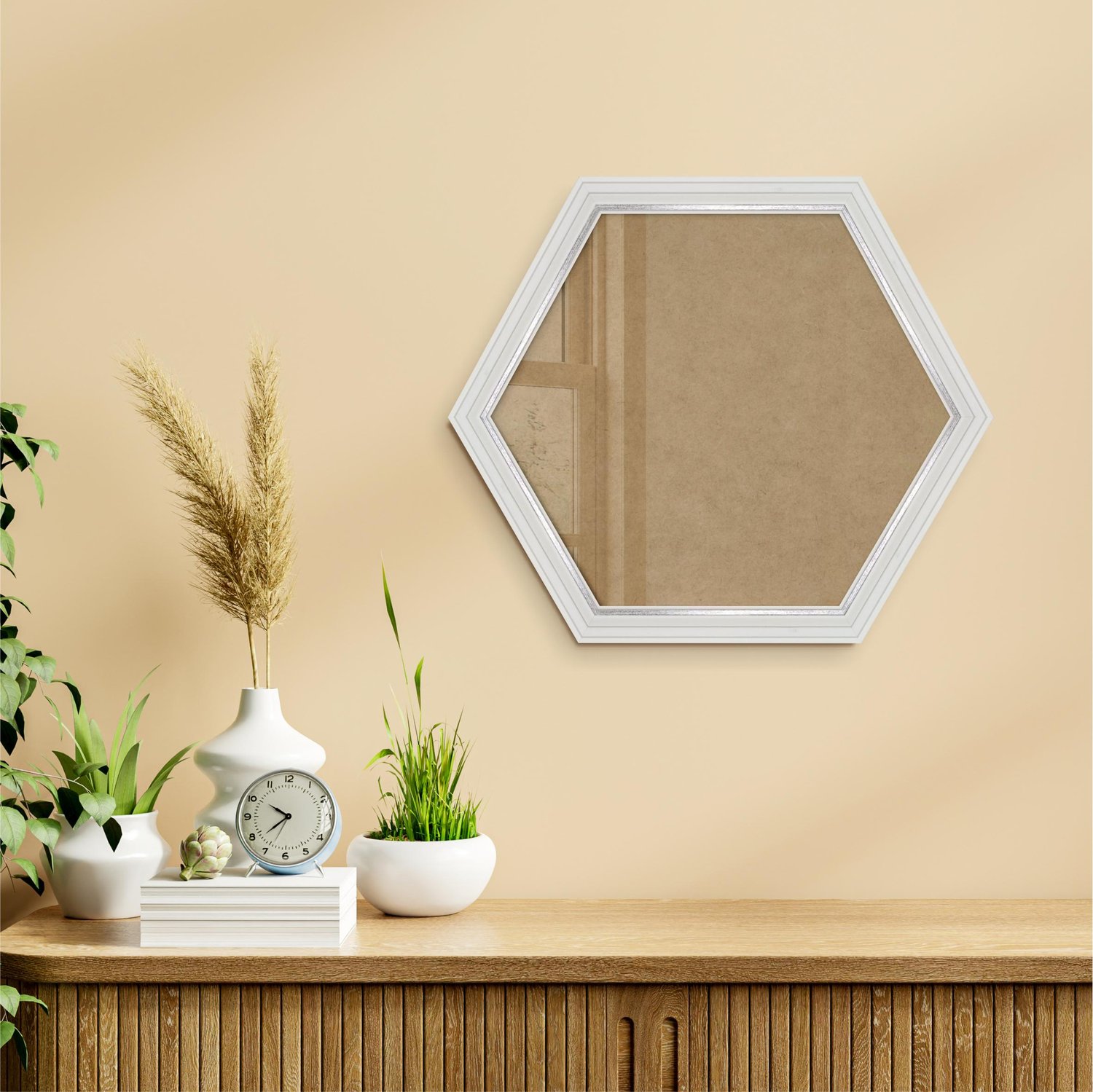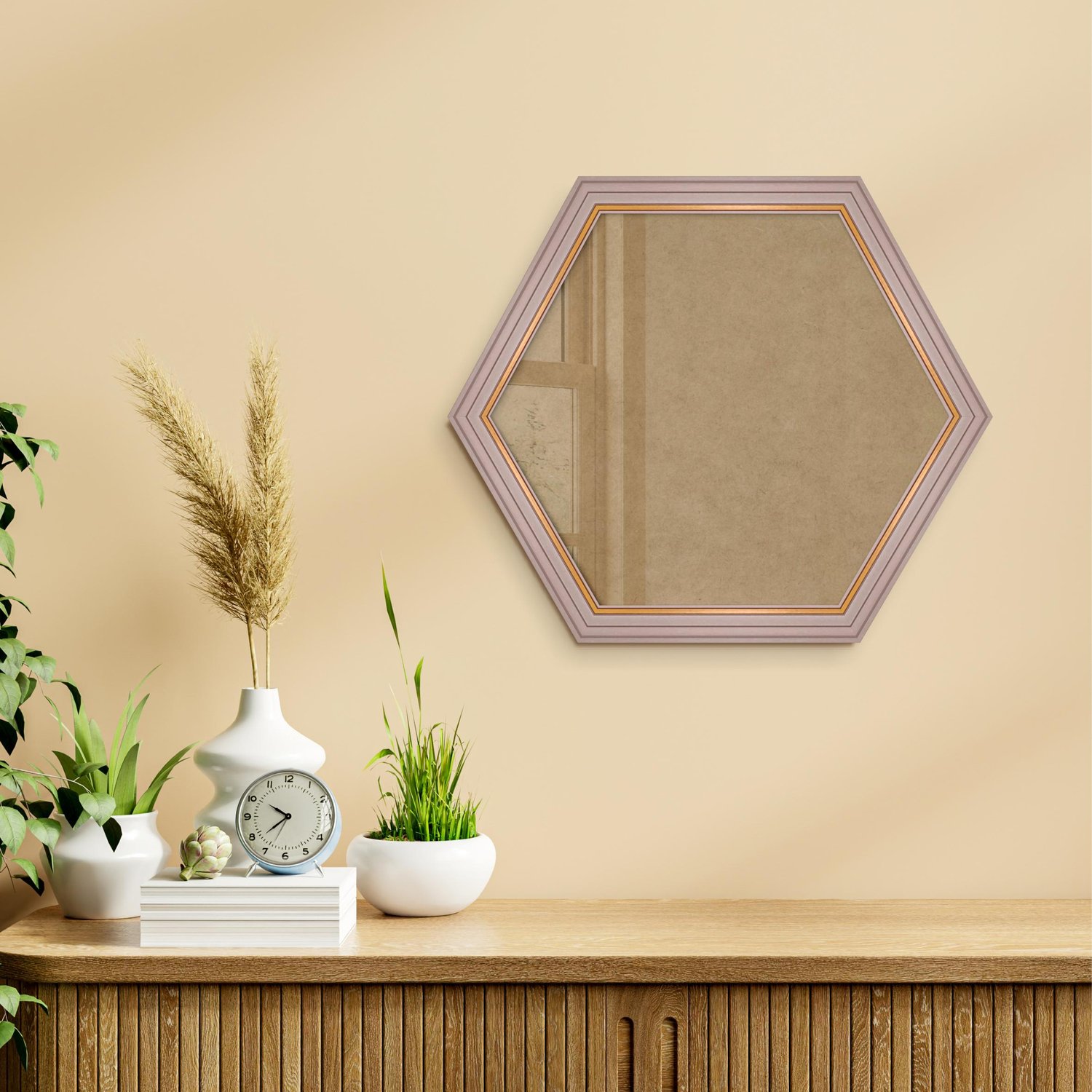 Moldura Hexagonal Micro Metalizada para Quadros de parede. Essa moldura recebe uma leve camada de gesso sobre a madeira e depois é laqueada.