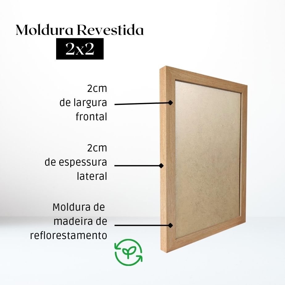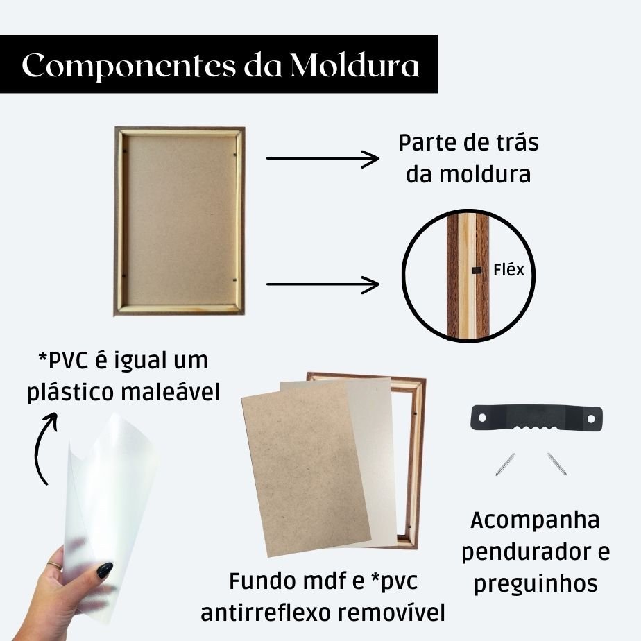 Material: Moldura revestida com laminação, fundo em mdf 3mm e frente em PVC antirreflexo, esse PVC é maleável e substitui perfeitamente o acetato e o vidro, deixando um aspecto levemente texturizado.