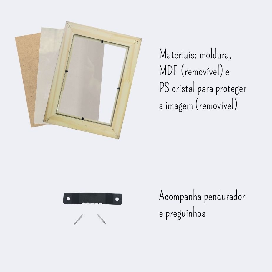 Material: Moldura, fundo em mdf 3mm e frente em PS Cristal transparente de 1mm. O PS tem uma transparência e aspecto similar ao vidro, como ponto positivo, o PS é mais resistente ao transporte