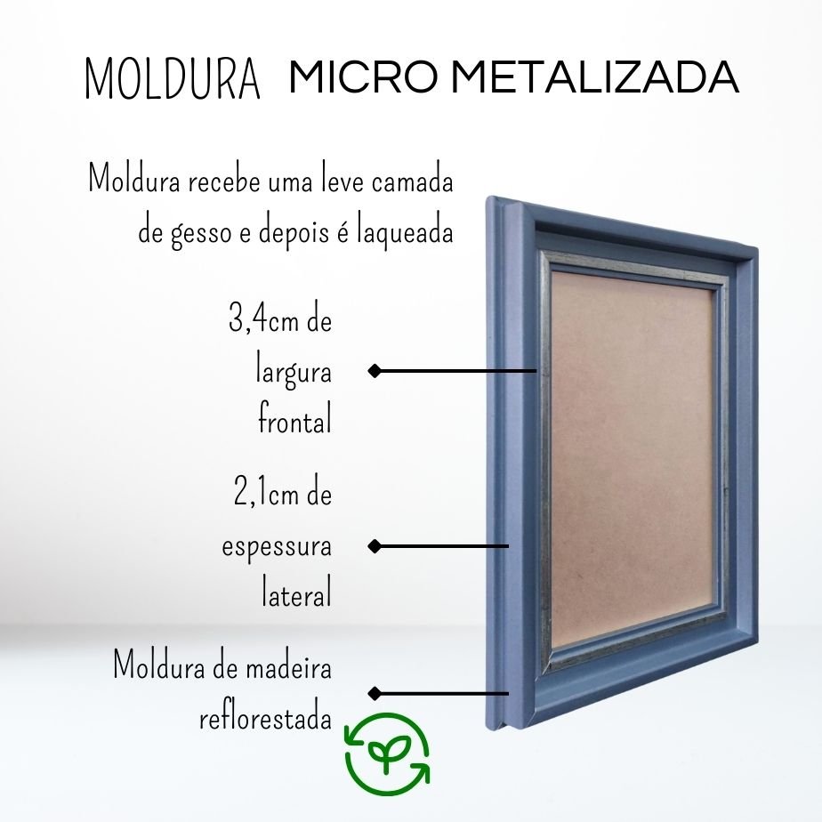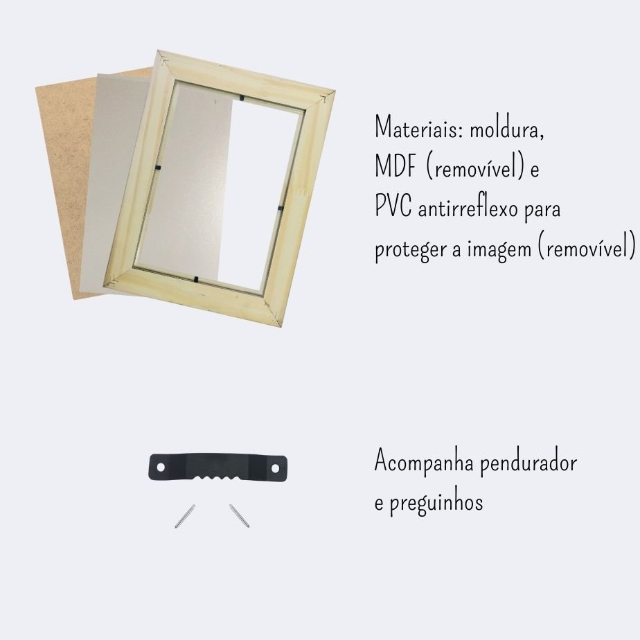 Material: Moldura, fundo em mdf 3mm e frente em PVC antirreflexo, esse PVC é maleável e substitui perfeitamente o acetato e o vidro, deixando um aspecto levemente texturizado.