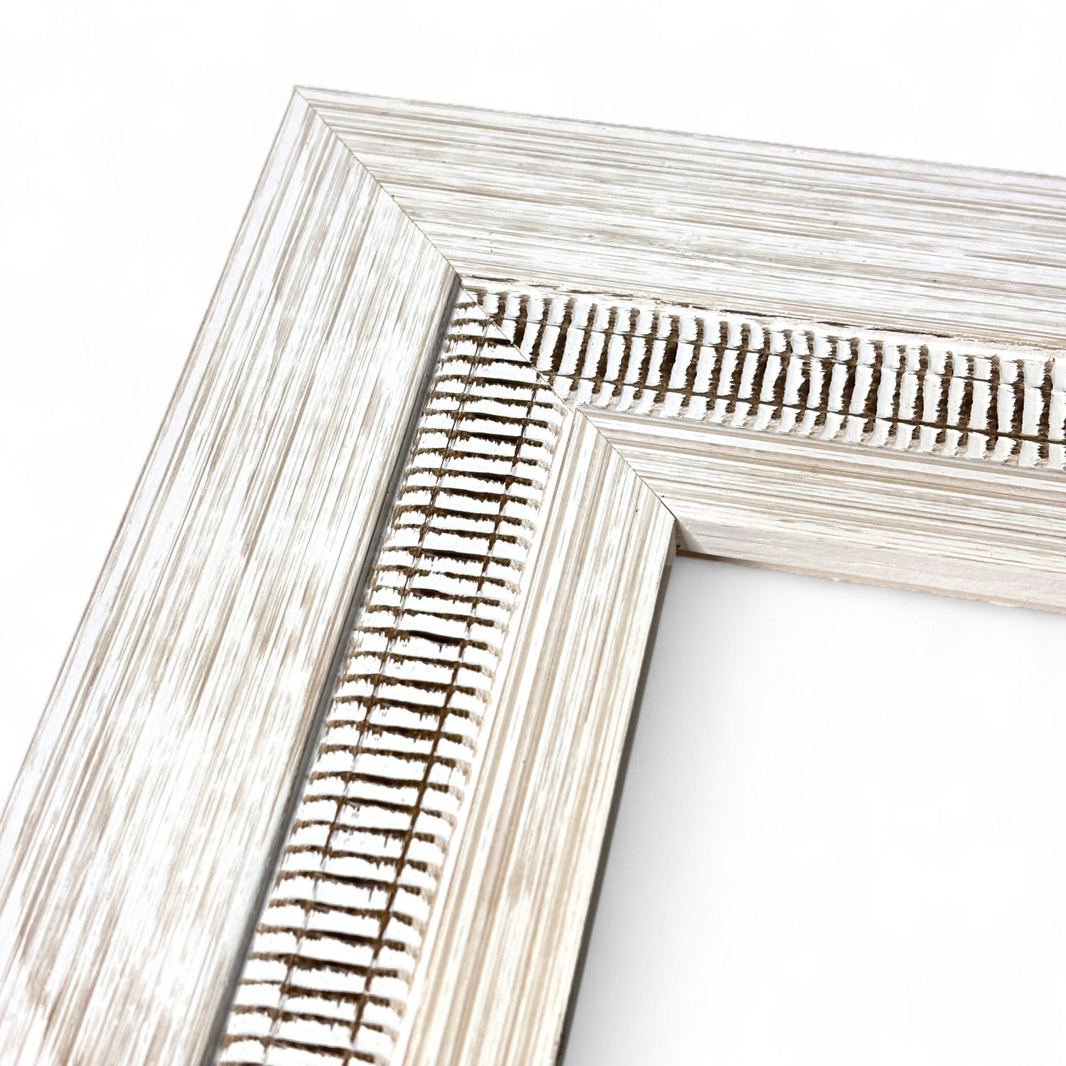 Com 6,6 cm de largura e 1,7 cm de profundidade, é uma moldura que se impõe com elegância. Está disponível em dois acabamentos que atendem estilos distintos com igual refinamento: o tom amadeirado escuro, que valoriza os veios naturais da madeira e transmite rusticidade contemporânea, e o branco provençal, com leve aspecto envelhecido que remete ao charme do estilo europeu.
